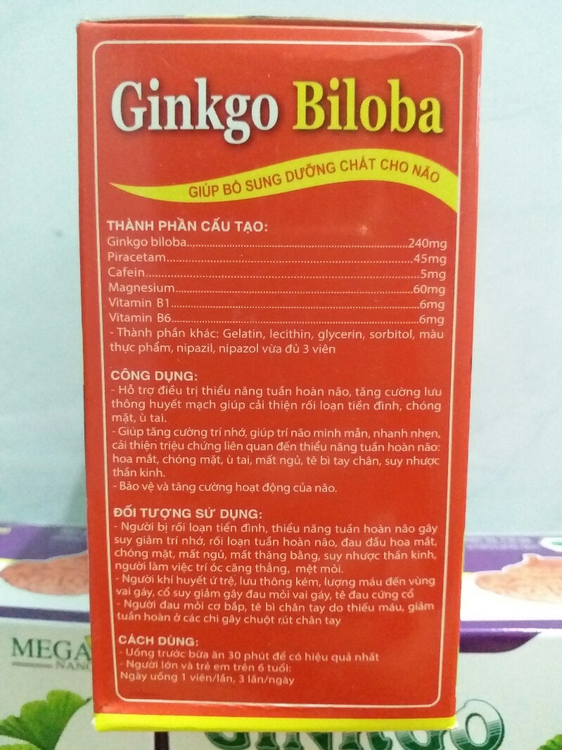 Ginkgo Biloba 240mg đỏThành phần:Ginkgo Biloba...........240mgPiracetam ........45mgCafein.......5mgMagne B6........60mgVitamin B1......6mgVitamin B6.......6mgĐóng gói:Hộp 10 vỉ x 10 viên