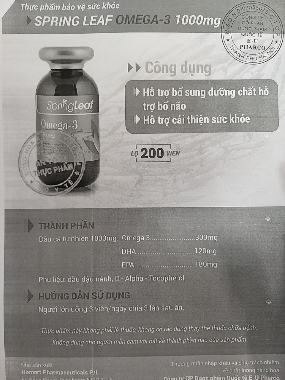 Dầu cá Spring Leaf Omega 3 1000mg bổ não và mắt hộp 200 viên của Úc
