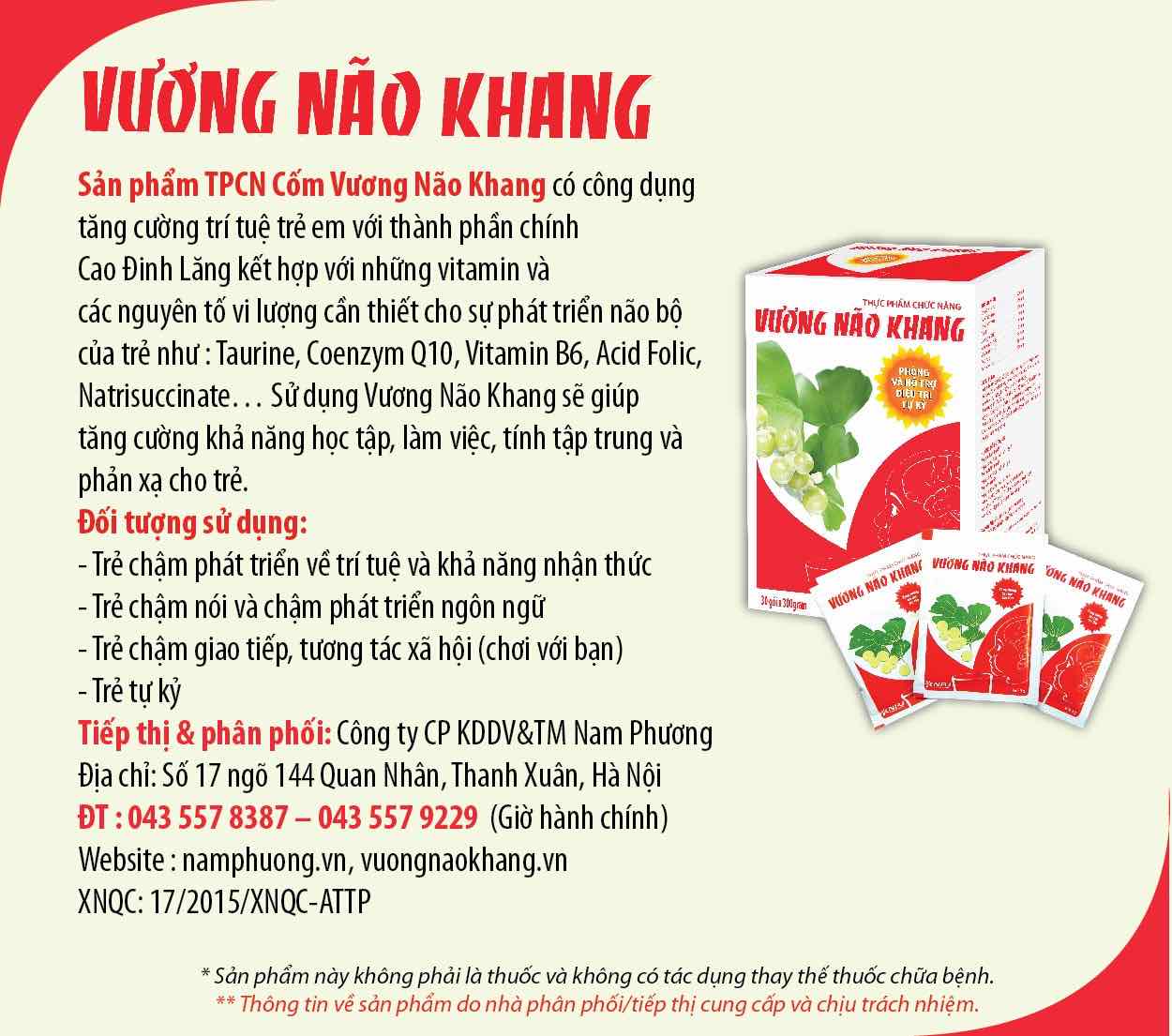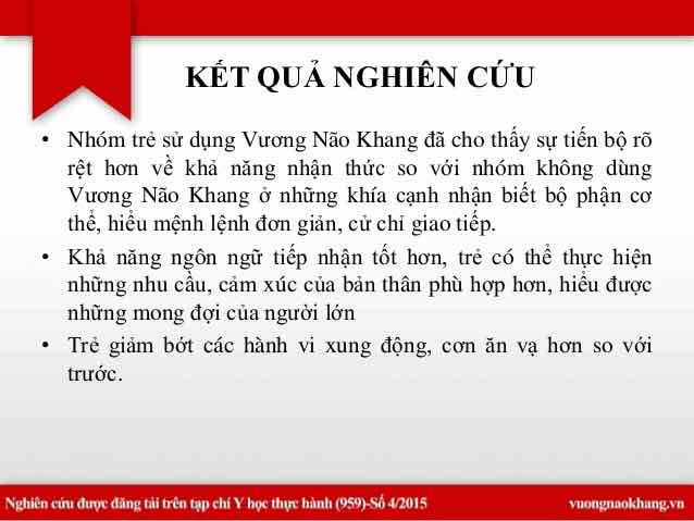 Thực phẩm chức năngVương Não Khangsử dụng các thành phần cao đinh lăng, thăng ma, bạch quả kết hợp với Taurine, Coenzyme Q10... trong công thức giúp hoạt huyết, tăng cường vi chất vànăng lượng cho não, tăng khả năng học tập, làm việc, khả năng tập trung và phản xạ, được dùng để hỗ trợ cho trẻ bị tự kỷ. Nên dùng Vương Não Khang trong các trường hợp trẻ em chậm phát triển về trí tuệ và khả năng nhận thức, trẻ chậm nói, chậm phát triển ngôn ngữ, chậm giao tiếp, tương tác với xã hội, trẻ em bị tự kỷ.