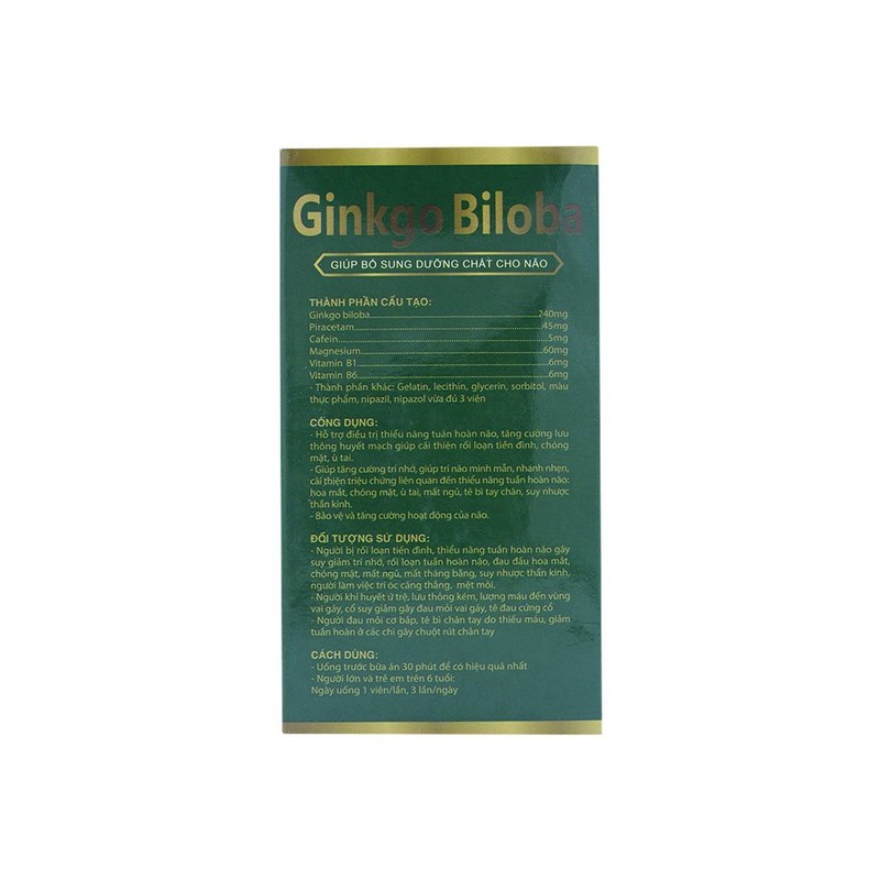 Ginkgo Biloba: 240mgPiracetam: 45mgCafein: 5mgMagnesium: 60mgVitamin B1: 6mgVitamin B6: 6mgThành phần khác: Gelatin, Lecithin, Glycerin, Sorbitol, màu thực phẩm, Nipazil, Nipazol vừa đủ 3 viên.