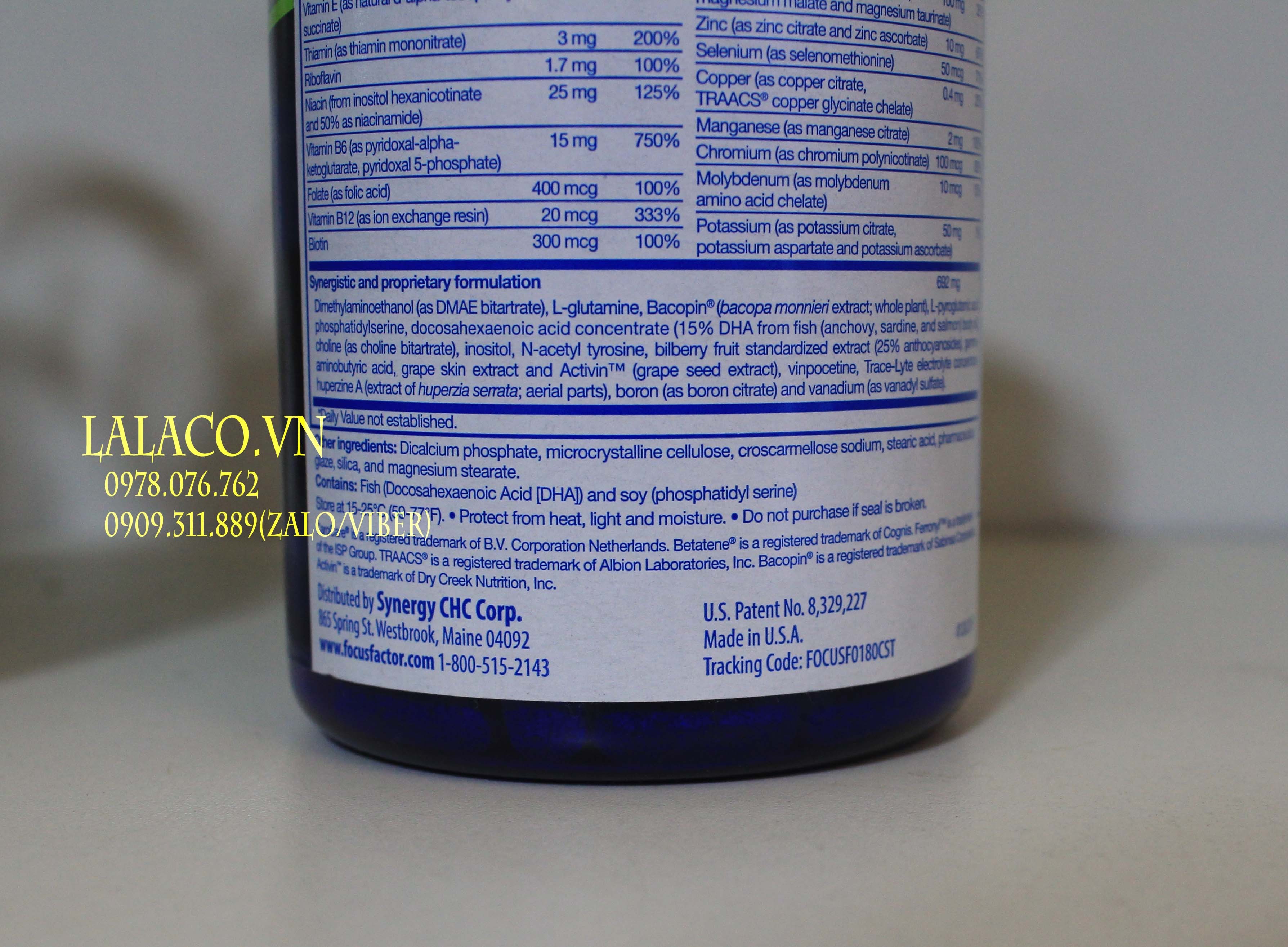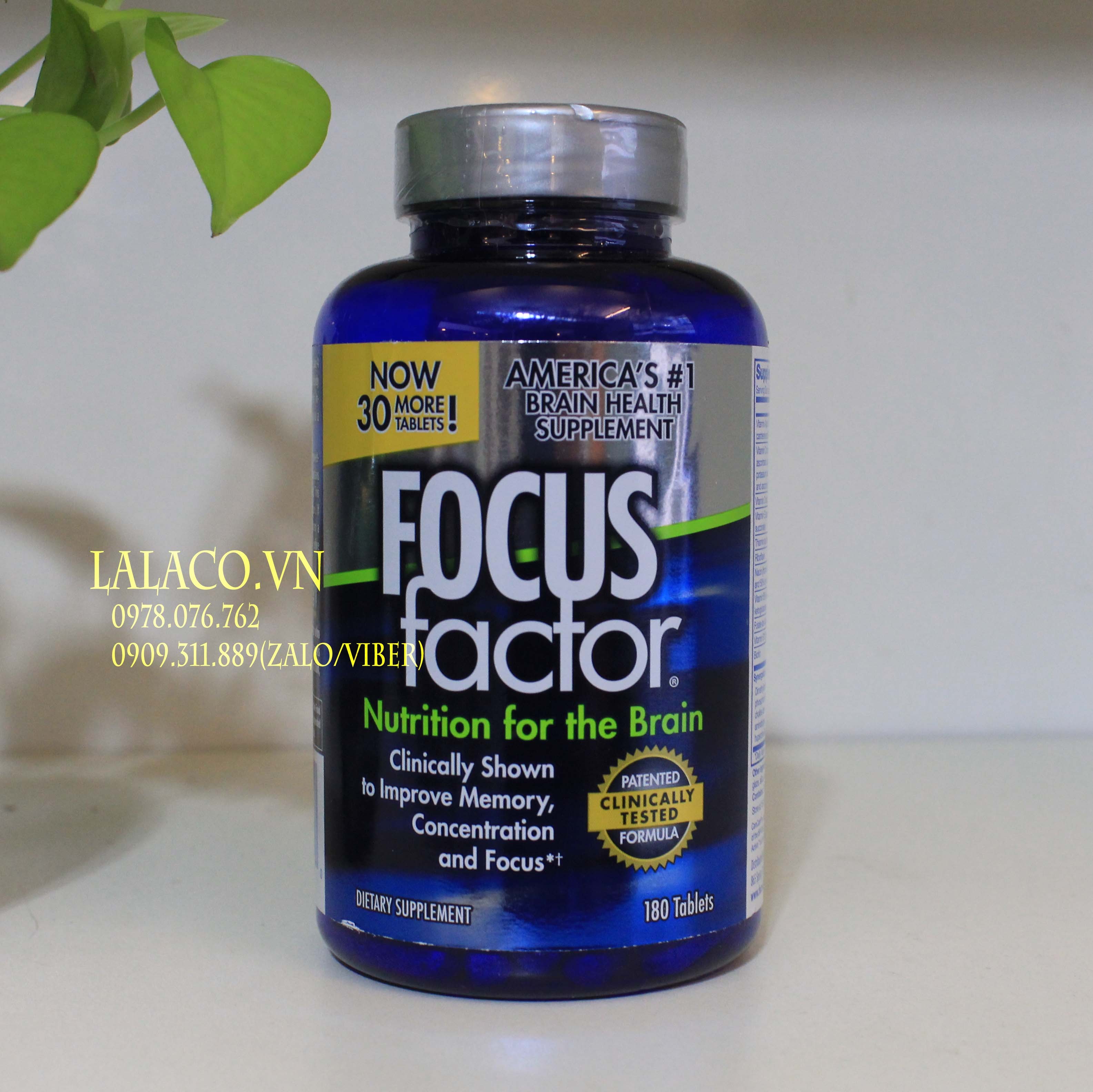 Focus Factor là viên uống bổ não được được chiết xuất bằng công thức độc đáo với sự pha trộn giữa các vitamin, khoáng chất, chất chống oxy hóa, chất chiết xuất thực vật, axit béo omega-3 như: DHA Omega-3, Vitamin D, Phosphatidylserine, Vitamin B-6 và B-12, Vitamin E, Canxi, giúp cung cấp dưỡng chất dành cho não giúp bổ não, tăng cường trí nhớ, tăng sự tập trung thích hợp cho người làm việc trí óc căng thẳng, học sinh đang trong thời kì ôn luyện thi cử, người già và hỗ trợ người sau tai biến.