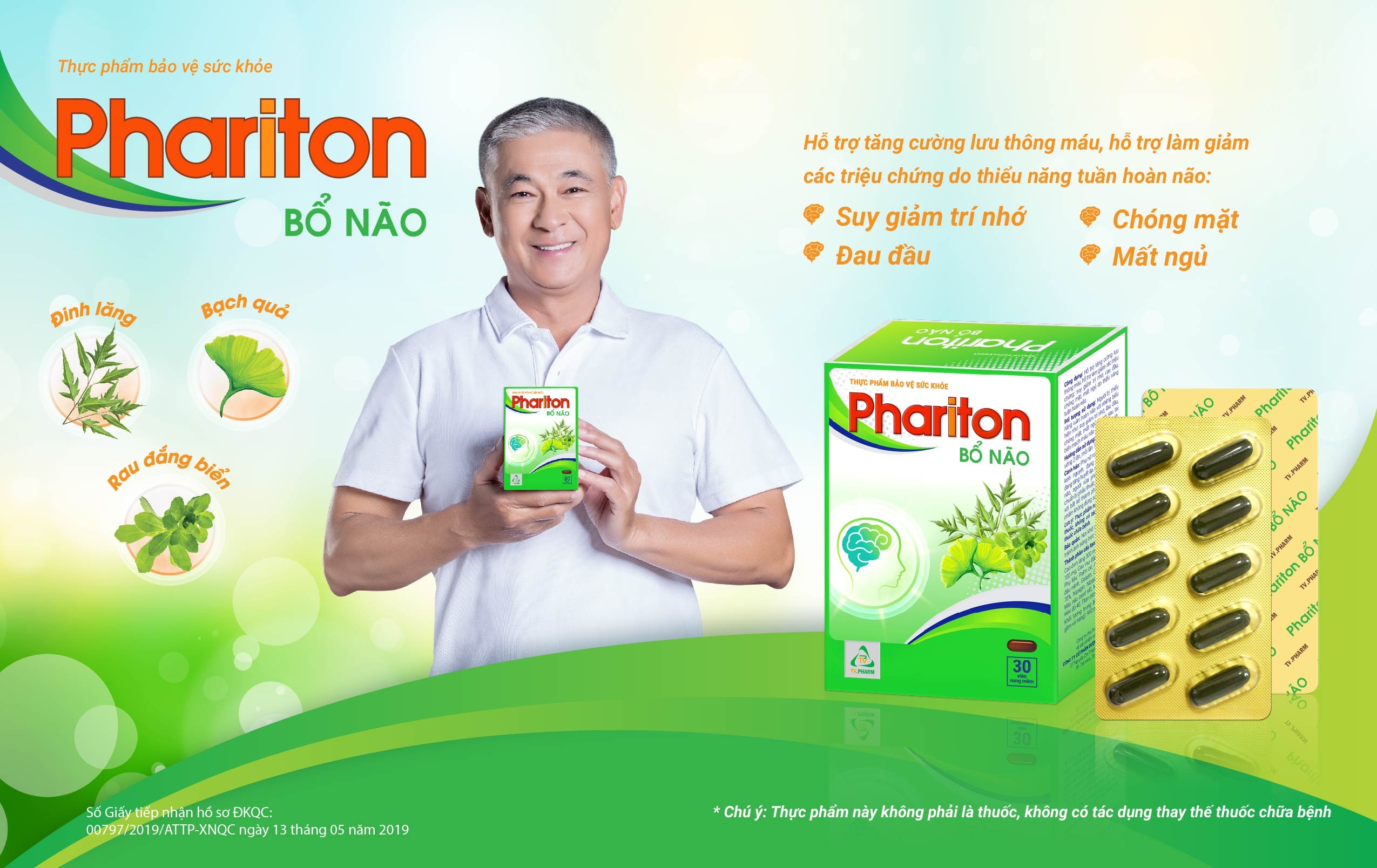 - Thực phẩm bảo vệ sức khỏe Phariton Bổ Não là sự kết hợp bộ ba thảo dược: Rau đắng biển có tác dụng điều trị và phòng ngừa bệnh Alzheimer, thiểu năng tuần hoàn não, tai biến mạch máu não. Đinh lăng có tác dụng thông mạch, bồi bổ khí huyết. Bạch quả với tác dụng cải thiện lưu thông tuần hoàn máu, điều trị bệnh sa sút trí tuệ, cải thiện trí nhớ.