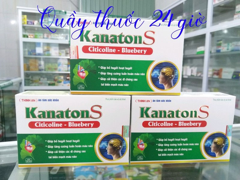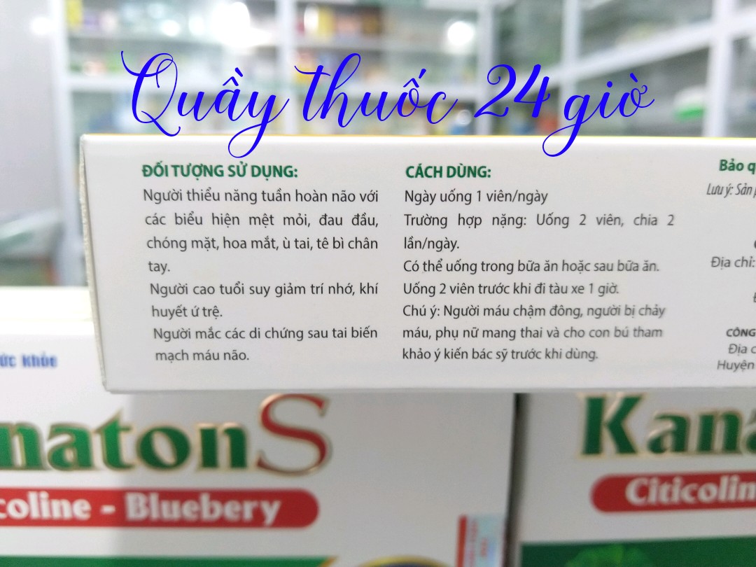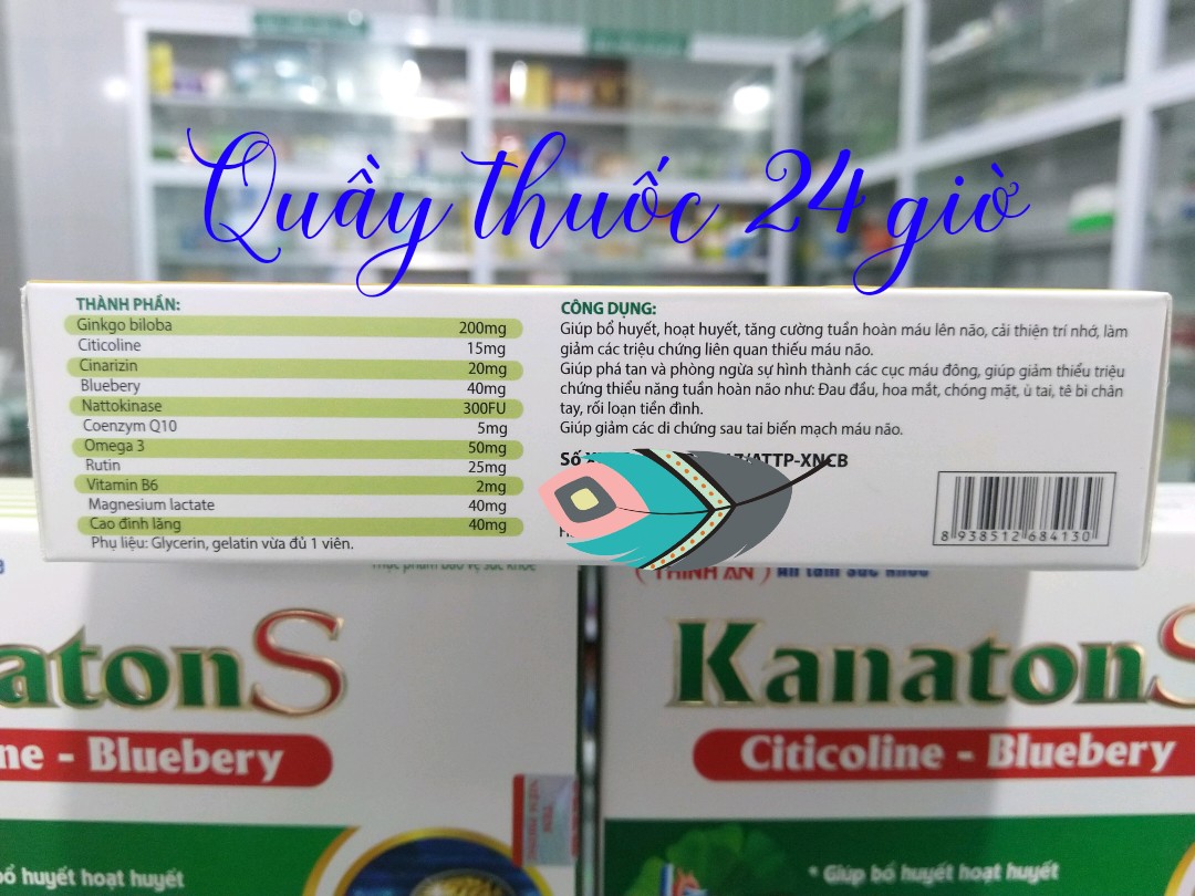 HOẠT HUYẾT DƯỠNG NÃO KANATONS*Giúp bổ huyết hoạt huyết*Giúp tăng cường tuần hoàn máu não*Giúp cải thiện di chứng sau tai biến mạch máu não+Thành phần:Ginko Biloba 200mgCiticoline 15mgCinarizin 20mgBluebery 40mgNattokinase 300FUCoenzym Q10 5mgO.mega 3 50mgRutin 25mgVitamin B6 2mgMagnesium lactate 40mgCao đinh lăng 40mg+Công dụng:-Giúp bổ huyết, hoạt huyết, tăng cường tuần hoàn máu lên não, cải thiện trí nhớ, làm giảm các triệu chứng liên quan thiếu máu não-Giúp phá tan và phòng ngừa sự hình thành các cục máu đông, giúp giảm thiểu triệu chứng thiểu năng tuần hoàn não như: đau đầu, hoa mắt, chóng mặt, ù tai, tê bì tay chân, rối loạn tiền đìnhGiúp giảm các di chứng sau tai biến mạch máu não+Đối tượng sử dụng:-Người thiểu năng tuần hoàn não với các biểu hiện mệt mỏi, đau đầu, chóng mặt, hoa mắt, ù tai, tê bì tay chân.-Người cao tuổi suy giảm trí nhớ, khí huyết ứ trệ-Người mắc các di chứng sau tai biến mạch máu não+Cách dùng:-Ngày uống 1 viên/ngày-Trường hợp nặng: Uống 2 viên, chia 2 lần/ngàyCó thể uống trong bữa ăn hoặc sau bữa ănUống 2 viên trước khi đi tàu xe 1 giờChú ý: người máu chậm đông, người bị chảy máu, , phụ nữ mang thai và cho con bú tham khảo ý kiến bác sỹ trước khi dùng