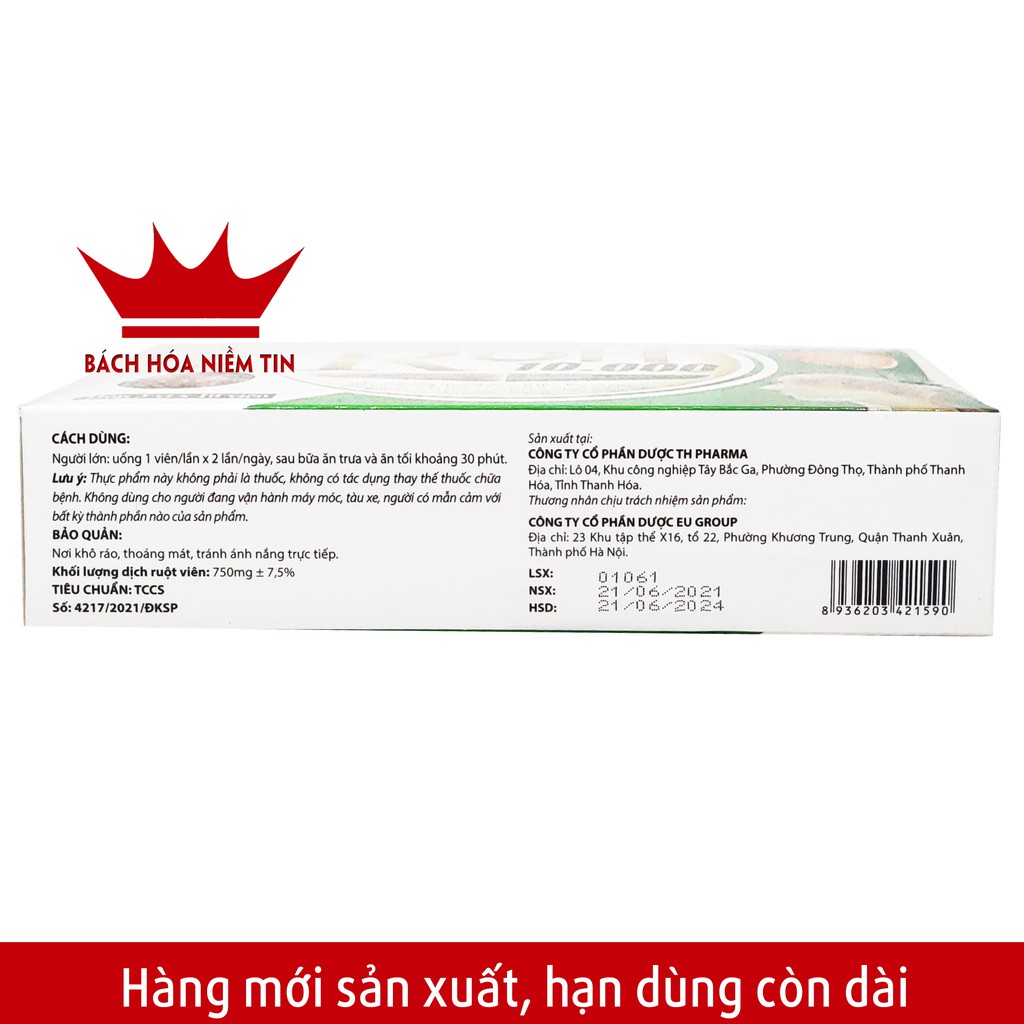 Cách sử dụng:- Người lớn: Uống 1 viên/lần x 2 lần/ngày, sau bữa ăn trưa và tối khoảng 30 phút.Sản phẩm được cấp phép bởi Bộ y tế, phân phối chính hãng bởi Bách Hóa Niềm Tin