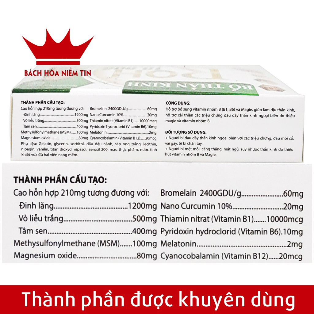 Thành phần kết hợp Thảo dược, vitamin B1, B6, B12, Magie và MSM vui lòng xem chi tiết trên ảnh mô tả sản phẩmĐối tượng sử dụng:- Người bị đau dây thần kinh ngoại biên với các triệu chứng: Đau mỏi cổ, vai gáy, tê bì chân tay- Người bị mệt mỏi, căng thằng, mất ngủ, suy nhược thần kinh do thiếu hụt vitamin nhóm B và Magie