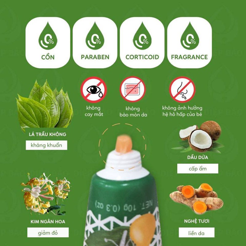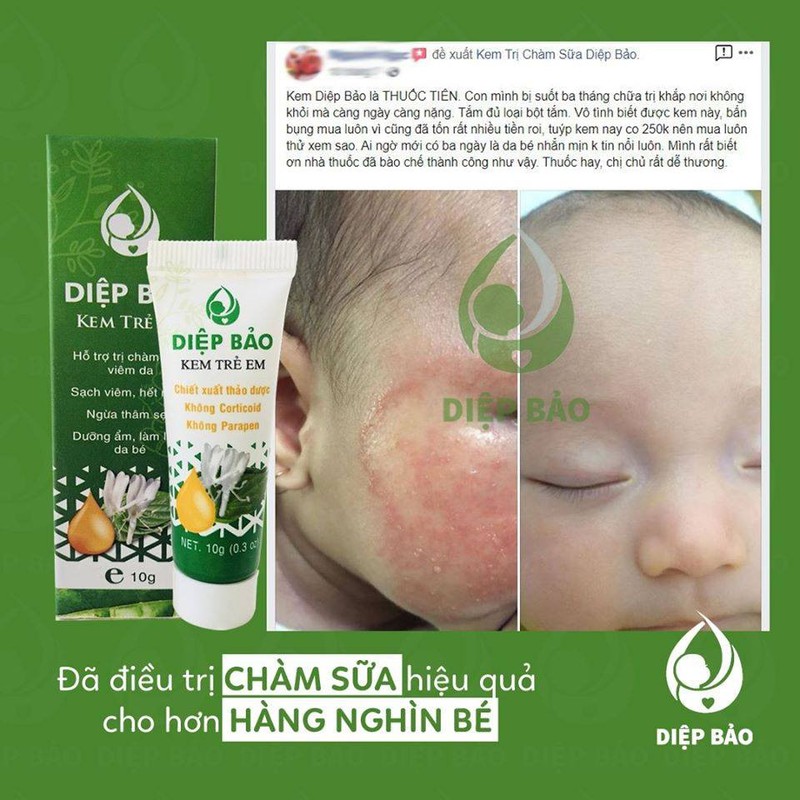 Kem trl chàm sữa DIỆP BẢO trl viêm da cơ địa, chàm sữa, ngứa rôm sảy, an toàn cho trẻ sơ sinh. Kem Diệp Bảo được làm thủ công theo công thức dân gian, gia truyền. Vì vậy, sản phẩm KHÔNG corticoid & KHÔNG chất bảo quản Paraben, được chiết xuất từ thiên nhiên, nhẹ dịu với làn da của em bé mà không bào mòn da em bé như các loại thuốc đang bán ngoài thị trường.