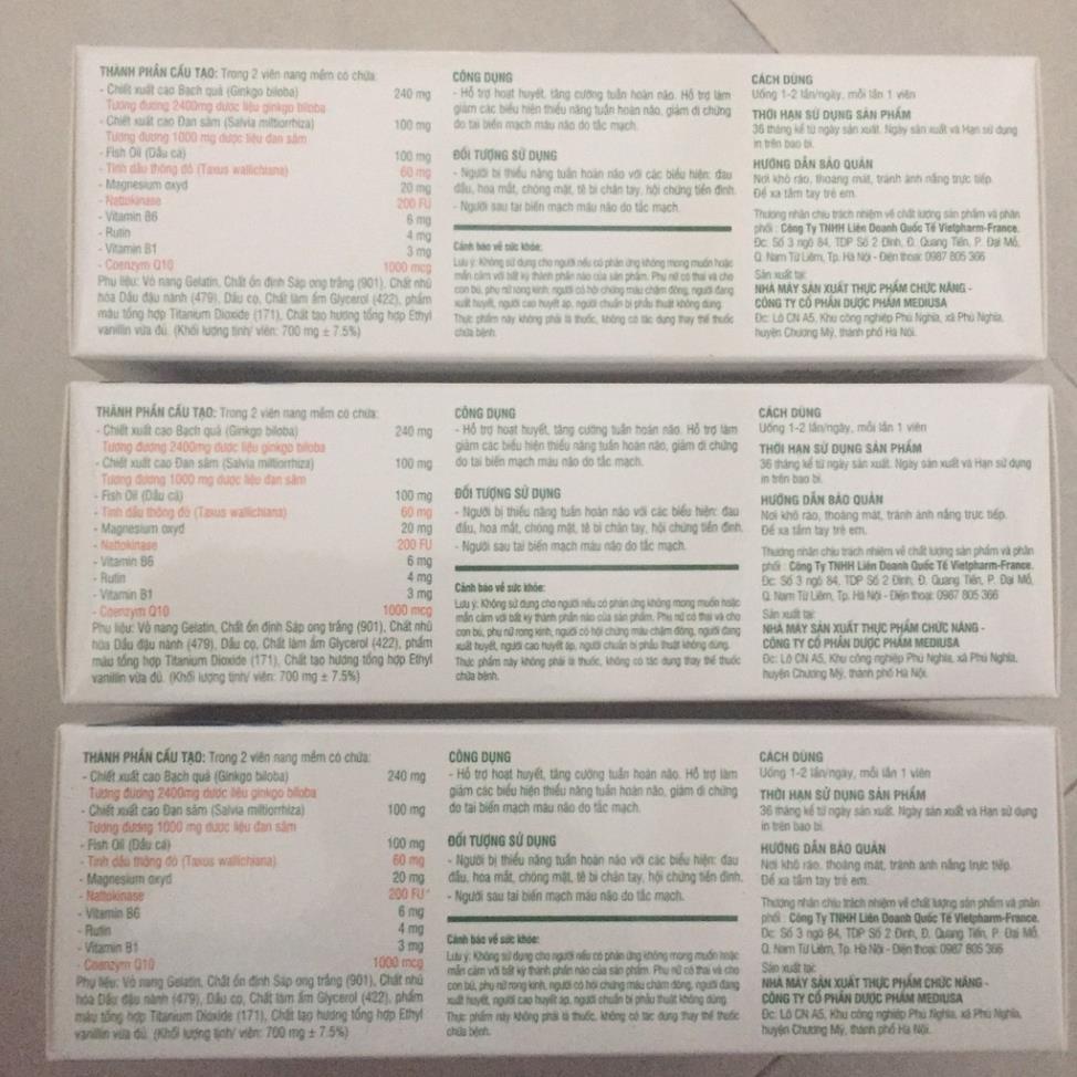 Viên uống bổ não PONAKA EXTRA NEW@ THÀNH PHẦN CẤU TẠO: - Chiết xuất cao Bạch Quả ( Ginkgo Biloba ): 240 mg- Chiết xuất cao Đan Sâm ( Salvia Miltiomhiza ): 100 mg- Fish oil ( Dầu cá ): 100 mg-Tinh dầu Thông Đỏ ( Taxus Wallichiana ): 60 mg- Magnesium Oxyd 20 mg- Nattokinase: 200 FU- Vitamine B6: 6 mg- Rutin: 4 mg- Vitamine B1: 3 mg- Coenzym Q10: 1000 mcg@ CÔNG DỤNG:- Giúp hoạt huyết, tăng cường tuần hoàn não.- Hỗ trợ làm giảm các biểu hiện thiểu năng tuần hoàn não.- Giảm các di chứng do tai biến mạch máu não.@ ĐỐI TƯỢNG SỬ DỤNG:- Người bị thiểu năng tuần hoàn não với các biểu hiện: đau đầu, hoa mắt, chóng mặt, tê bì chân tay, hội chứng tiền đình.- Người sau tai biến mạch máu não do tắc mạch@ CÁCH DÙNG:Ngày uống 2 lần: buổi sáng, tốiMỗi lần uống 1 viên@ THỜI HẠN SỬ DỤNG SẢN PHẨM:36 tháng kể từ ngày sản xuất.Ngày sản xuất và Hạn sử dụng được in trên bao bì.@ HƯỚNG DẪN BẢO QUẢN:- Bảo quản nơi khô ráo, thoáng mát, tránh ánh sáng trực tiếp- Để xa tầm tay trẻ em@ LƯU Ý KHI SỬ DỤNG SẢN PHẨM:- Sản phẩm này không phải là thuốc, không có tác dụng thay thế thuốc chữa bệnh.- Không sử dụng cho người mẫn cảm với bất kỳ thành phần nào của sản phẩm.- Không dùng cho phụ nữ có thai và cho con bú, phụ nữ rong kinh, người có hội chứng máu chậm đông, người đang xuất huyết, người cao huyết áp, người chuẩn bị phẫu thuật.@ SẢN XUẤT TẠI: Công ty Cổ phần Dược phẩm MEDIUSA@ THƯƠNG NHÂN CHỊU TRÁCH NHIỆM VỀ CHẤT LƯỢNG VÀ PHÂN PHỐI:Công ty TNHH Liên doanh Quốc tế Vietpharm - FranceĐịa chỉ: Đường Quang Tiến - Phường Đại Mỗ - Quận Nam Từ Liêm - TP Hà NộiĐiện thoại: 0987805366#thucphambonao#ginkgobiloba#thucphambaovesuckhoe#tuanhoannao#nattokinase#hoathuyetduongnao