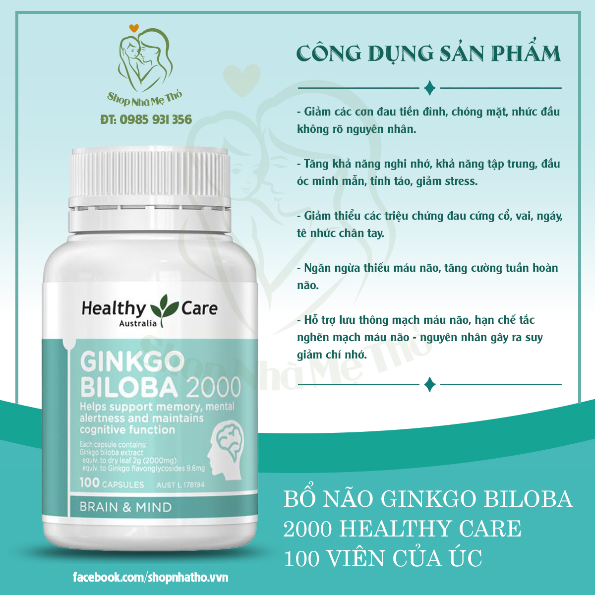 SHOP MẸ THỎ xin giới thiệu Sản phẩm Bổ não Ginkgo Biloba 2000 Healthy Care 100v mẫu mới, date mới🔰 Quy cách:Hãng sản xuất: Healthy CareXuất xứ: ÚcQuy cách sản phẩm: hộp 100 viênĐối tuổi sử dụng: dành cho cả nam và nữ🔰 Thành phần của Ginkgo Biloba Healthy Care- Chiết xuất: Ginkgo biloba lá... 2000mg(2g)- Chứa flavonglycosides Ginkgo... 9,6mg🔰 Đối tượng sử dụng Viên Ginkgo Biloba Healthy Care - Sản phẩm dành cho người lớn và trẻ em trên 12 tuổi, hỗ trợ tốt đối với các trường hợp:- Người suy giảm trí nhớ, tuần hoàn não kém- Người thường xuyên gặp tình trạng đau đầu, hoa mắt, chóng mặt, mất ngủ, mất thăng bằng do thiếu máu lên não.- Người mắc vấn đề về: suy giảm trí nhớ, sa sút trí tuệ- Thích hợp với người thường xuyên làm việc trí óc căng thẳng, học sinh, sinh việc trong giai đoạn thi cử.🔰 Hướng dẫn{ơ sử dụng Ginkgo Biloba Healthy Care - Liều dùng: Người trên 12 tuổi: ngày uống 3 lần/ 1 viên, nên uống sau khi ăn để có hiệu quả tối ưu.- Lưu ý khi sử dụng:Sản phẩm không dùng với trẻ em dưới 12 tuổi, phụ nữ có thai hoặc đang cho con bú, người mẫn cảm với bạch quả, người bị rối loạn đông máuTham khảo ý kiến của chuyên gia trước khi sử dụng nếu bạn đang sử dụng các sản phẩm kê đơn khác.Sản phẩm không có tác dụng thay thế các sản phẩm kê đơn hạ áp.Bảo quản sản phẩm ở nơi khô ráo, thoáng mát, tránh tiếp xúc trực tiếp với ánh nắng mặt trời đồng thời cũng cần tránh nơi ẩm thấp. Để xa tầm tay trẻ em.