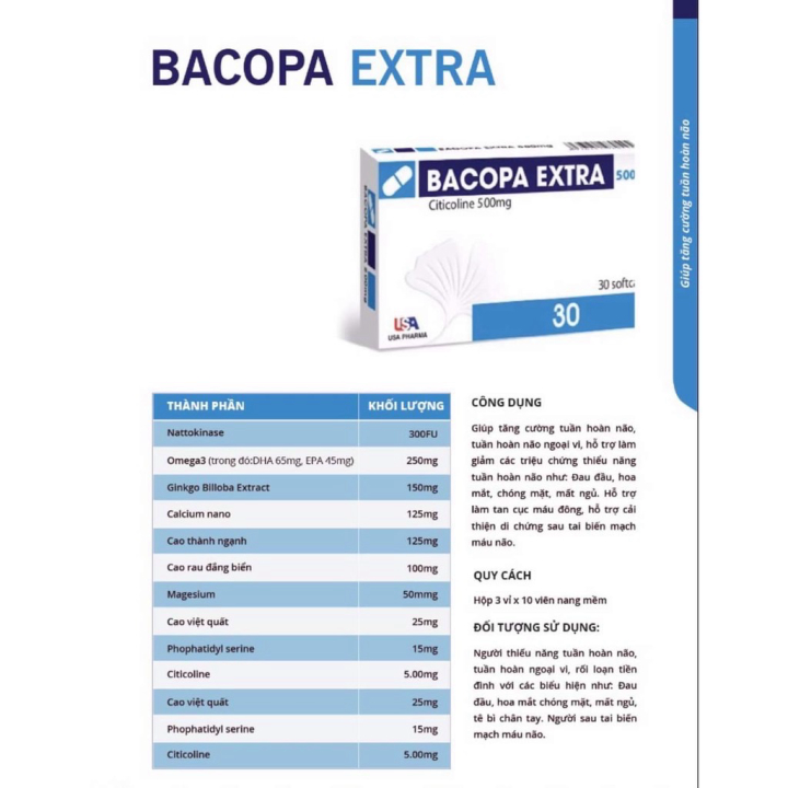 (Chính Hãng) BACOPA EXTRA Cải thiện mất ngủ đau nữa đầu suy giảm trí nhớ hiệu quả hộp 30 viên chính hãng
