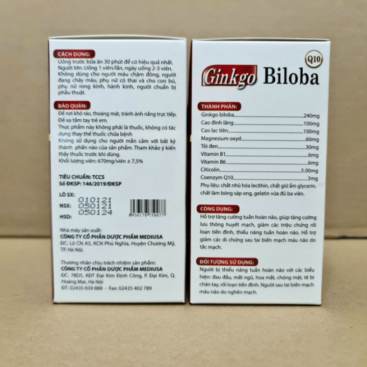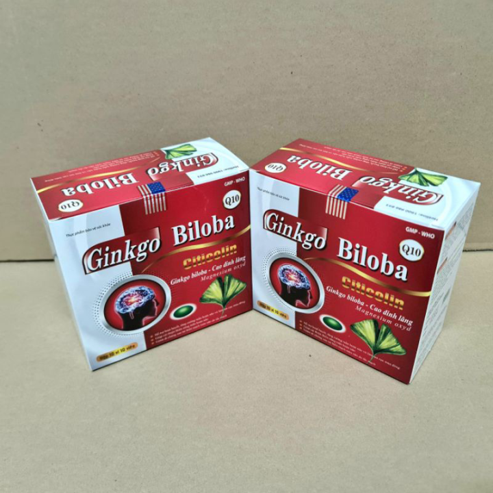GINKGO biloba CITICOLIN Q10 hộp 100 viên giúp:- Hỗ trợ hoạt huyết, tăng cường tuần hoàn não và làm tan cục máu đông- Giups cải thiện thiểu năng tuần hoàn não- Giamr di chứng sau tai biến mạch máu não do tắc mạchCông dụng : ✅ Hỗ trợ tăng cường tuần hoàn não, giúp tăng cường lưu thông huyết mạch✅ Giảm các triệu chứng rối loạn tiền đình, thiểu năng tuần hoàn não.✅ Hỗ trợ giảm các di chứng sau tai biến mạch máu não do tắc mạch ĐỐI TƯỢNG SỬ DỤNGNgười thiểu năng tuần hoàn não với các biểu hiện: Hoa amwts, chóng mặt, tê bì chân tay. rối loạn tiền đìnhNgười sau tai biến mạch máu não do nghẽn mạchNgười thiếu máu, lưu thông máu kém, thường xuyên cảm thấy đau đầu, hoa mắt, chóng mặt ù tai, suy giảm trí nhớ, đau nhức, tê bì chân tay.Người suy nhược thần kinh, lo âu, rối loạn giấc ngủ, ngủ không ngon giấc.Người làm việc trí óc căng thẳng.Người bị không Alzheimer và Parkinson.Hoạt huyết dưỡng não dùng cho người làm việc tri óc căng thẳng.HƯỚNG DẪN SỬ DỤNGUống trước ăn 30p để hiệu quả tốt nhất.Người lớn: uống 1 viên/lần, ngày uống 2-3 viênNhà sản xuất: CÔNG TY CỔ PHẦN DƯỢC PHẨM QUỐC TẾ USAĐ/c: Cụng công nghiệp Thanh Oai, huyện Thanh Oai, Hà NộiThương nhân sản xuất và chịu trách nhiệm chất lượng sản phẩm:FRANCEPHARM.,JSCĐịa chỉ: 69C1, KĐT Đại Kim Định Công, phường Đại Kim, Quận Hoàng Mai, Hà Nội