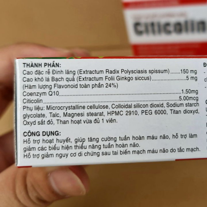 Hoạt huyết dưỡng não CiticolinCông dụng: Hỗ trợ hoạt huyết, giúp tăng cường tuần hoàn máu não, hỗ trợ làm giảm các biểu hiện thiểu năng tuần hoàn não.Hỗ trợ giảm nguy cơ di chứng sau tai biến mạch máu nãoCách dùng:Uống 2-3 viên/lần x 2-3 lần/ngàyKhông dùng cho người có hội chứng máu chậm đông, đang chảy máu, chuẩn bị phẫu thuật, cơn huyết áp cấp, người xuất huyết não, phụ nữ rong kinh, trong thời kỳ kinh nguyệt, phụ nữ có thai, trẻ dưới 12 tuổi.