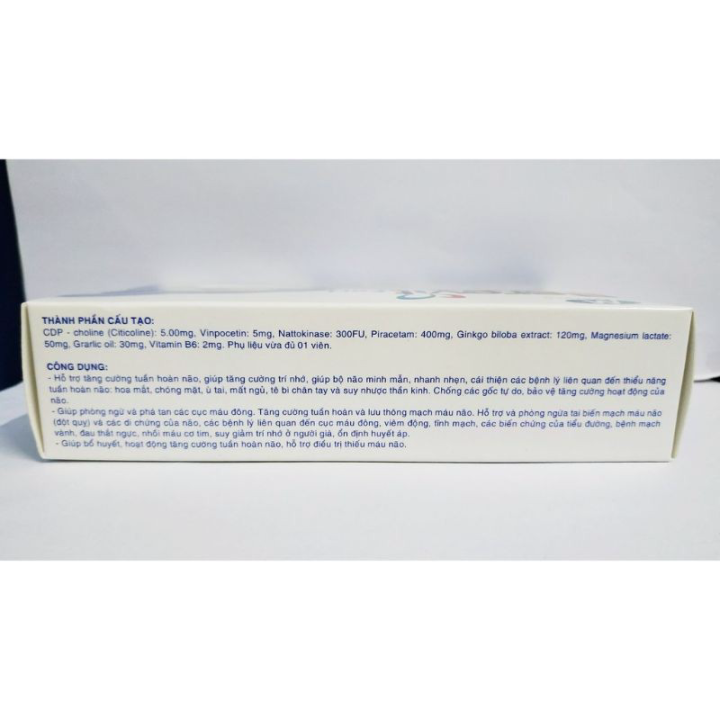 CÔNG DỤNG:- Bổ sung dưỡng chất cho não, hỗ trợ tăng cường tuần hoàn não, giúp tăng cường trí nhớ,giúp bộ não minh mẫn nhanh nhẹn, cải thiện các không lý liên quan đến thiểu năng tuần hoàn não : hoa mắt, chóng mặt ù tai, mất ngủ, tê bì chân tay và suy nhược thần kinh.- Chống các gốc tự do bảo vệ tang cường hoạt động của não.- Giúp phòng ngừa và phá tan các cục máu đông. Tăng cường tuần hoàn và lưu thông mạch máu não.- Hỗ trợ phòng ngừa tai biến mạch máu não ( đột quỵ ) và các di chứng của não, các không lý liên quan đến cục máu đông, các biến chứng của không tiểu đường, không mạch vành, đau thắt ngực, nhồi máu cơ tim, suy giảm trí nhớ ở người già, ổn định huyết áp.- Giúp bổ huyết, hoạt huyết, hỗ trợ hỗ trợ làm giảm thiếu máu nãoĐỐI TƯỢNG SỬ DỤNG:- Người bị nhức đầu, ù tai, chóng mặt, suy giảm trí nhớ, kém tập trung, thiểu tỉnh táo, sa sút trí tuệ, rối loại giấc ngủ do thiểu năng tuần hoàn máu não. Người lao động trí óc, học tập căng thẳng.- Người khí huyết ứ trệ, lưu thông kém, lượng máu đến vùng vai gáy cổ suy giảm gây đau mỏi vay gáy, tê đau cứng cổ.- Người đau mỏi cơ bắp, tê bì chân tay do thiếu máu, giảm tuần hoàn ở các chi gây chuột rút chân tay.- Dùng dự phòng cho người say tàu xe, nhằm giảm các phản ứng kích thích khi đi tàu xe.CÁCH DÙNG:- Ngày uống 1 viên/1 ngày- Trường hợp nặng uống 2 viên chia 2 lần/ngày.- Có thể uống trong hoặc sau bữa ăn.- Uống 2 viên trước khi đi tàu xe 1 giờ..