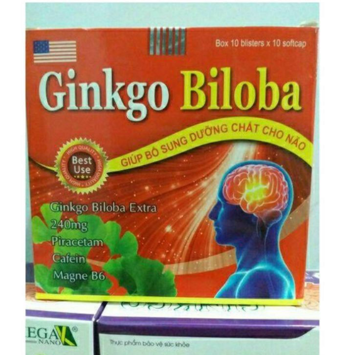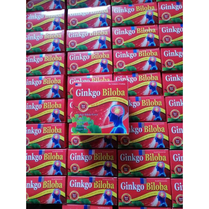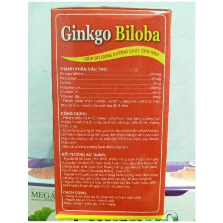 Ginkgo biloba 240 mgGiúp bổ sung dưỡng chất cho nãoCÔNG DỤNG.- Hỗ trợ hỗ trợ làm giảm thiểu năng tuần hoàn não, tăng cường lưu thông huyết mạch giúp cải thiện rối loạn tiền đình, chóng mặt, ù tai.- Giúp tăng cường trí nhớ, giúp trí não minh mẫn, nhanh nhẹn, cải thiện triệu chứng liên quan đến thiểu năng tuần hoàn não: hoa mắt, chóng mặt, ù tai, mất ngủ, tê bì tay chân, suy nhược thần kinh.- Bảo vệ và tăng cường hoạt động của não.ĐỐI TƯỢNG SỬ DỤNG.- Người bị rối loạn tiền đình, thiểu năng tuần hoàn não gây suy giảm trí nhớ, rối loạn tuần hoàn não, đau đầu hoa mắt, chóng mặt, mất ngủ, mất thăng bằng, suy ngược thần kinh, người làm việc trí óc căng thẳng, mệt mỏi.- Người khí huyết ứ trệ, lưu thông kém,, lượng máu đến vùng vai gáy, cổ suy giảm gây đau mỏi vai gáy, tê đau cứng cổ.- Người đau mỏi cơ bắp, tê bì chân tay do thiếu máu, giảm tuần hoàn ở các chi gây chuột rút chân tay.CÁCH DÙNG.- Uống trước ăn 30 phút để có hiệu quả nhất.- Người lớn và trẻ em trên 6 tuổi: 1 viên/lần x 3 lần/ngày.