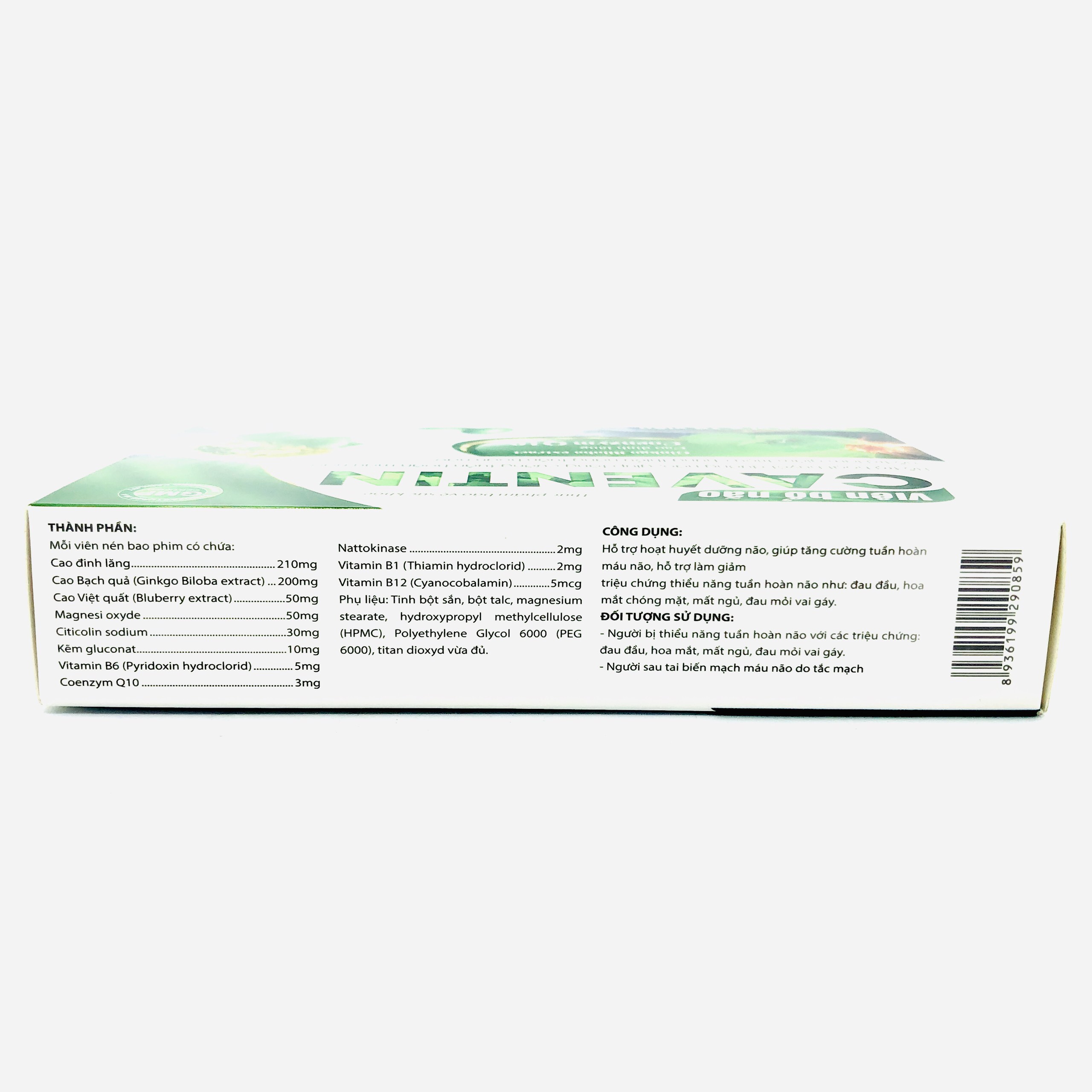 Thành phần: mỗi viên nén bao phim có chứa Cao Đinh lăng 210 mg Cao Bạch quả( Ginkgo Biloba extract) 200 mg Cao Việt quất( Blueberry extract) 50 mg Magnesi oxyde 50 mg Citicolin sodium 30 mg Kẽm gluconat 10 mg Vitamin B6( Pyridoxin hydroclorid) 5 mg Coenzym Q10 3 mg Nattokinase 2 mg Vitamin B1( Thiamin hydroclorid) 2 mg Vitamin B12( Cyanocobalamin) 5 mcg Phụ liệu: Tinh bột sắn, bột talc, magnesium stearate, hydroxypropyl methylcellulose (HPMC), Polyethylene Glycol 6000(PEG 6000), titan dioxyd vừa đủ.