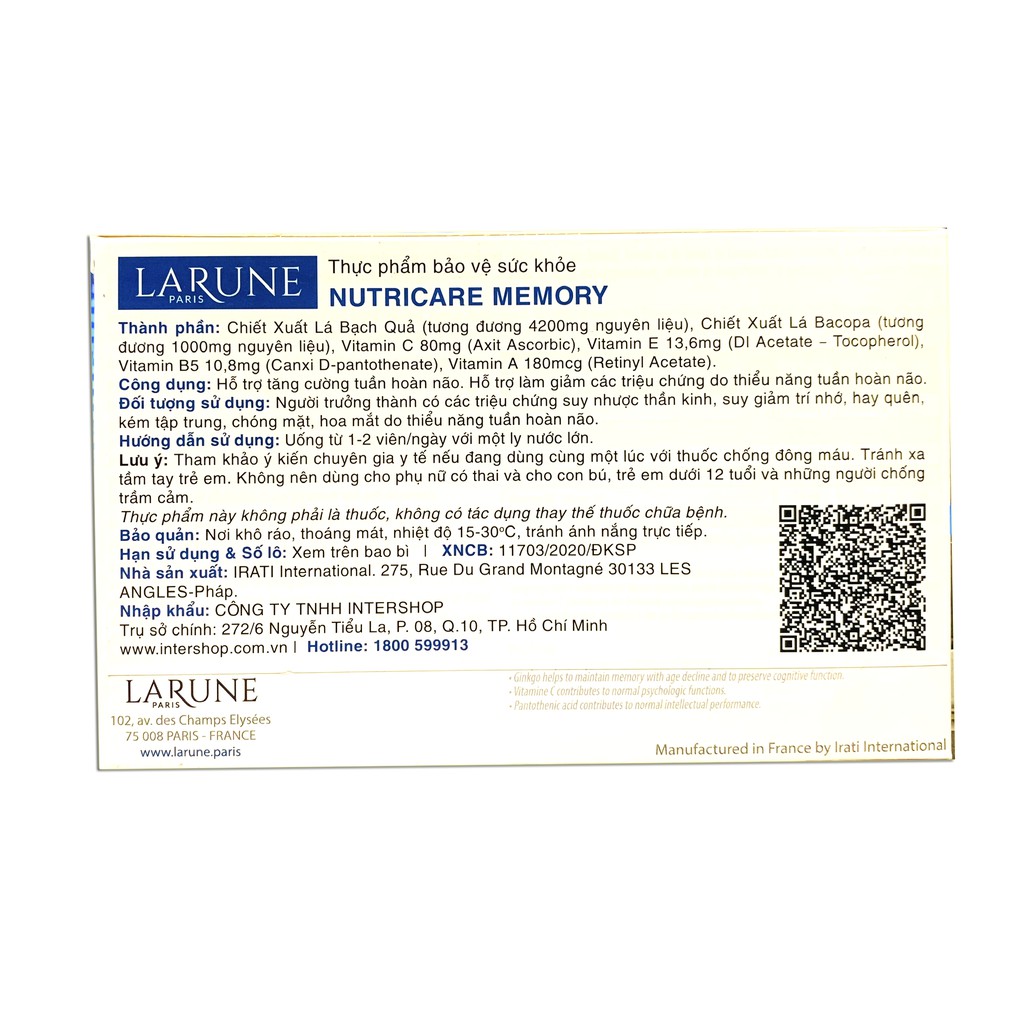 NUTRICARE MEMORY - GIẢI PHÁP TĂNG CƯỜNG TRÍ NHỚ, KHẢ NĂNG TẬP TRUNG & CHỨC NĂNG TUẦN HOÀN NÃO• Bạn đang thấy mình có dấu hiệu suy giảm trí nhớ, hay quên?• Bạn rất khó tập trung khi làm việc hoặc học tập?• Bạn đang có các dấu hiệu như đau đầu, hoa mắt chóng mặt do thiểu năng tuần hoàn não?Nếu bạn đang gặp các vấn đề kể trên thì sử dụng sản phẩm Nutricare Memory Larune với công thức vô cùng độc đáo, cũng là sự kết hợp duy nhất trên thị trường hiệu nay giữa bộ 3 Ginkgo Biloba, Vitamin B5 và Bacopa (rau đắng biển) sẽ giúp bạn giải quyết những vấn đề này.ƯU ĐIỂM NỔI BẬT• Sản phẩm duy nhất trên thị trường chứa vitamin B5 kết hợp với Ginkgo Biloba giúp dẫn truyền, vận chuyển tuần hoàn máu não hiệu quả hơn.• Hàm lượng Bacopa cao nhất (1000mg) giúp giảm thiểu năng tuần hoàn não như đau đầu, chóng mặt, suy giảm trí nhớ, Alzheimer...• Thương hiệu nội địa của Pháp.CÔNG DỤNG• Hỗ trợ tăng cường tuần hoàn não.• Hỗ trợ làm giảm các triệu chứng do thiểu năng tuần hoàn não.THÀNH PHẦNChiết xuất lá bạch quả 4200mg (Ginkgo Biloba), Chiết xuất rau đắng biển 1000mg (Bacopa), Vitamin B5 10.8mg (canxi D-pantothenate), Vitamin C 80mg (axit ascorbic), Vitamin E 13.6mg (dl acetate – tocopherol), Vitamin A 180mcg (retinyl acetate).ĐỐI TƯỢNG SỬ DỤNGNgười trưởng thành có các triệu chứng suy nhược thần kinh, suy giảm trí nhớ, hay quên, kém tập trung, chóng mặt, hoa mắt do thiểu năng tuần hoàn não.CÁCH DÙNG - LIỀU DÙNGUống 1 viên/lần, từ 1 – 2 lần/ngày.BẢO QUẢNNơi khô ráo, thoáng mát, nhiệt độ 15 – 30oC, tránh ánh nắng trực tiếp. Tránh xa tầm tay trẻ em.LƯU Ý• Tham khảo ý kiến chuyên gia y tế nếu đang dùng cùng một lúc với thuốc chống đông máu.• Không nên dùng cho phụ nữ có thai và cho con bú, trẻ em dưới 12 tuổi và những người chống trầm cảm.• Sản phẩm này không phải là thuốc và không có tác dụng thay thế thuốc chữa bệnh.THÔNG TIN THÊM• Thương hiệu: Larune Paris• Xuất xứ: Pháp• Nhà sản xuất: Irati International• Địa chỉ: 275, Rue Du Grand Montagne 30133 Les Angles, Pháp.Larune Paris là thương hiệu được sản xuất bởi Irati International - nhà máy nổi tiếng toàn cầu trong lĩnh vực sản xuất dược phẩm & thiết bị y tế tại Pháp nhờ sở hữu tới 3 trung tâm nghiên cứu tại Clermont-Ferrand, Beauvais và Avignon nên điểm mạnh của Irati là liên tục cải tiến các công thức sản phẩm nhằm mang đến những sản phẩm chất lượng tốt nhất cho người dùng.Irati hiện là đối tác sản xuất của nhiều tập đoàn dược phẩm hàng đầu thế giới với nhiều chứng nhận quốc tế như ISO 9001, 22000 và 22716, GPM, đáp ứng 100% tiêu chuẩn cho thị trường EU & Mỹ.#Larune #Nutricare #NutricareMemory #GinkgoBiloba