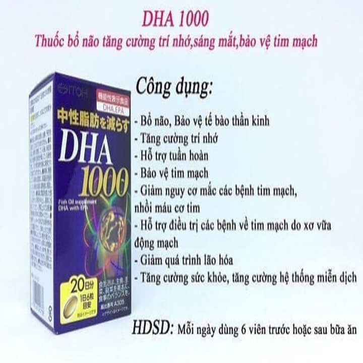 Các bố mẹ muốn con Tinh mắt , thông minh.- Ai mất ngủ , nhức đầu , căng thẳng , - Mệt mỏi , chóng mặt , áp lực g việc , áp lực gia đình Tác dụng của viên uống bổ não DHA ITOH 1000 Nhật BảnNão bộ của chúng ta có đến 60% được cấu thành từ các loại chất béo trong đó có 25% là DHA. DHA 1000 Nhật Bản bổ sung DHA tự nhiên cho não bộ qua đó tăng cường khả năng ghi nhớ của não bộ, cải thiện thị lực ( DHA chiếm tới 93% lượng axid béo ở võng mạc), hỗ trợ phát triển hệ thần kinh ở trẻ em.Hỗ trợ, ngăn chặn quá trình lão hóa xảy ra ở não bộ những người cao tuổi.DHA và EPA có trong viên uống bổ não DHA 1000 Nhật Bản còn có tác dụng làm giảm cholesterol, triglyceride, LDL cholesterol, ức chế quá trình g vón tiểu cầu, ngăn ngừa hình thành huyết khối qua đó phòng ngừa và hỗ trợ xơ vữa động mạch.Tăng cường khả năng miễn dịch của cơ thể, tăng tuần hoàn máu