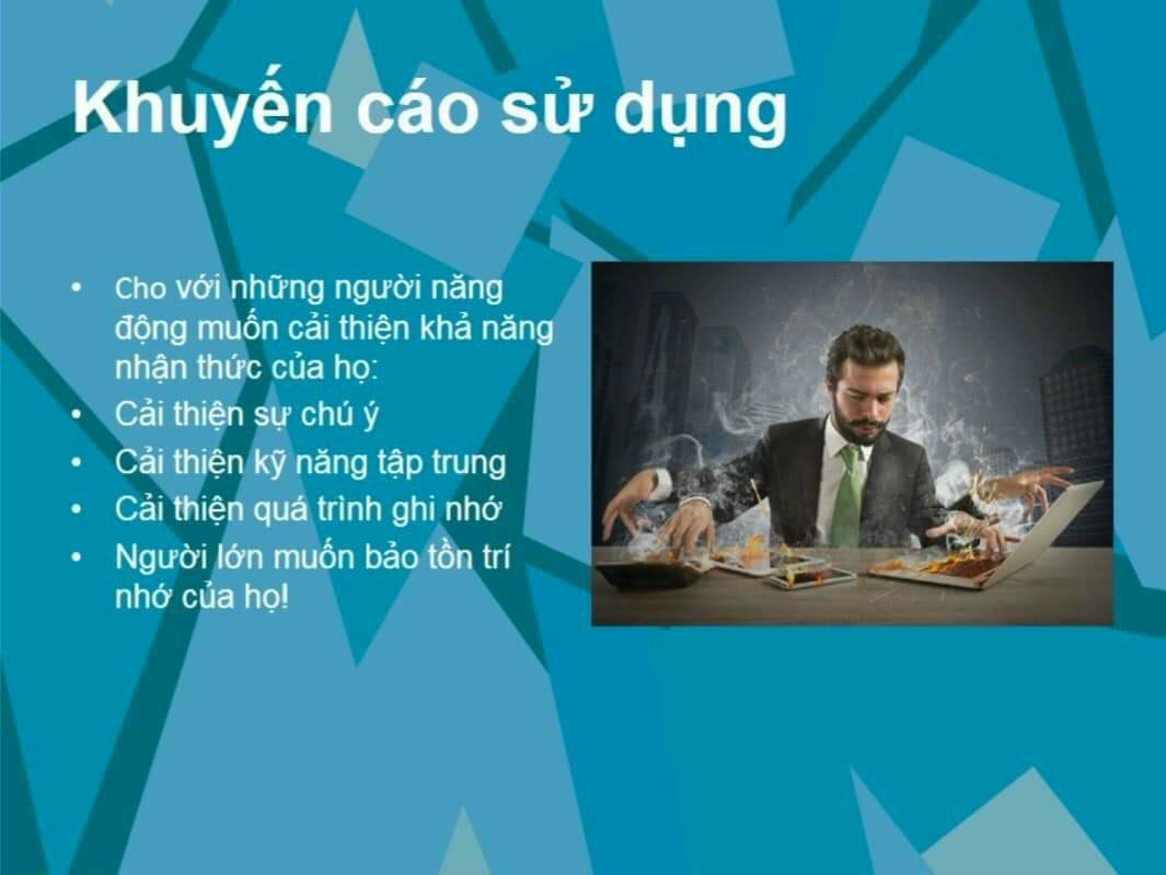 ★ ĐỐI TƯỢNG SỬ DỤNG:- Tất cả những ai quan tâm tới sức khoẻ của mình và muốn duy trì hoạt động của não và hệ thần kinh trong kỷ nguyên của công nghệ thong tin và căng thẳng thần kinh thường xuyên.- Những người mà tính chất công việc của họ gắn với trách nhiệm cao, phải suy nghĩ căng thẳng, công việc không đồng đều, hoạt động sáng tạo hay căng thẳng cao về cảm xúc tâm lý.- Những người muốn tăng cường khả năng trí tuệ.- Những người muốn cải thiện chức năng của não và bảo vệ tế bào não khỏi bị suy giảm.- Những người bị chứng đau đầu hành hạ, bị huyết áp cao, ù tai.- Những người đang chịu căng thẳng thần kinh, ngủ không đủ giấc, mệt mỏi.- Học sinh, sinh viên trong kỳ học thi để nâng cao tập trung và cải thiện trí nhớ.- Những người hút thuốc, uống café và bia rượu.- Những người bị chứng xơ vữa động mạch, muốn bảo vệ mạch máu khỏi mức cholesterol cao.