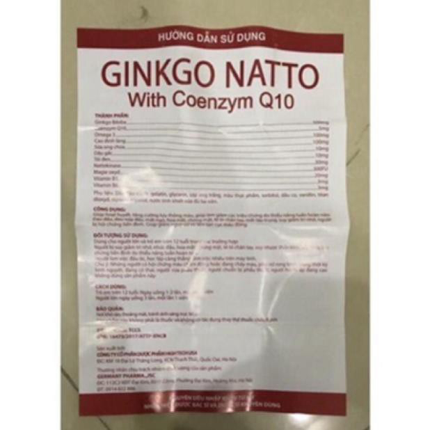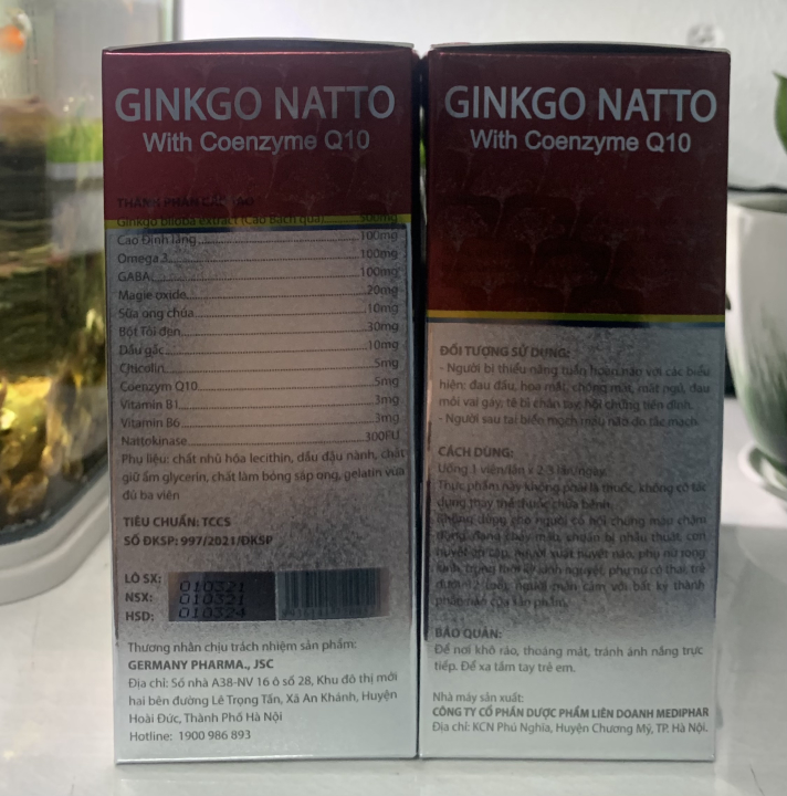 - Thành phầnGinkgo biloba 500mg, Coenzym Q10 5mg, Cao Đinh Lăng 100mg, Sữa ong chúa 10mg, Dầu gấc 10mg, Tỏi đen 30mg, Nattokinase 300FU, Vitamin B1, Vitamin B6…