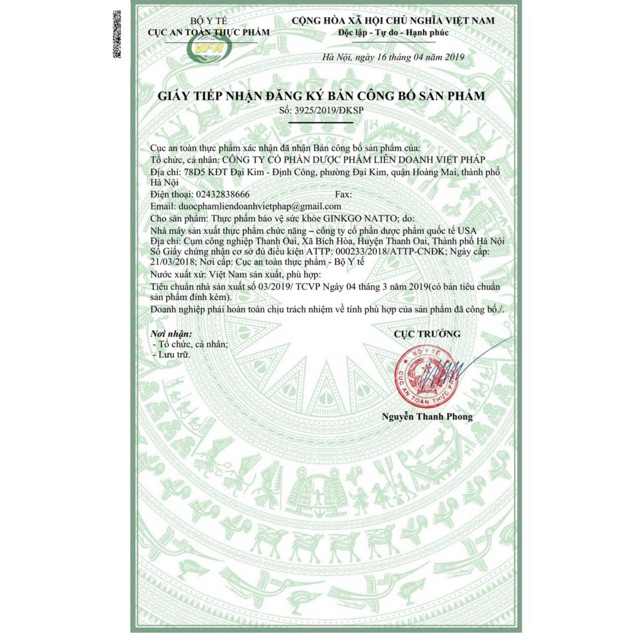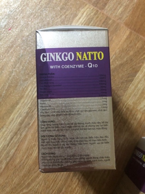 .Quy cách: Hộp 10 vỉ x 10 viên.BỔ NÃO GINKGO NATTO_100 VIÊNSản xuất tại: Công ty CP Dược phẩm Quốc tế USAĐC: KCN Thanh Oai, huyện Thanh Oai, Hà Nội.#GINKGO_NATTO_WITH_COENZYM_Q10_100VIÊN #Suy_tuần_hoàn_não_cấp_mạn, #giảm_tập _trung, #giảm_trí_nhớ # ù_tai, #chóng_mặt,