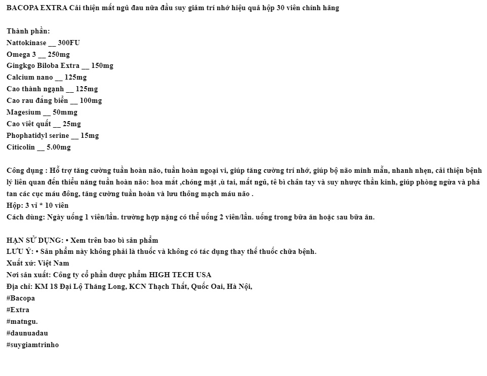 (Chính Hãng) BACOPA EXTRA Cải thiện mất ngủ đau nữa đầu suy giảm trí nhớ hiệu quả hộp 30 viên chính hãng
