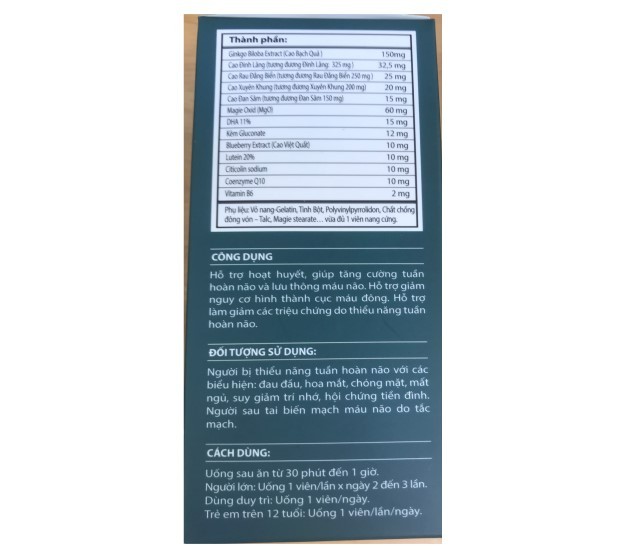 *Thành Phần Viên Uống PROGIN IQ GOLD:-Ginkgo biloba extract (cao bạch quả):.................................... 150mg-Cao đinh lăng (tương đương Đinh lăng: 325mg):................................ 32,5mg-Cao rau đắng biển (tương đương Rau đắng biển: 250mg):........................... 25mg-Cao Xuyên khung (tương đương Xuyên khung: 200mg):................................ 20mg-Cao Đan sâm (tương đương Đan sâm: 150mg):....................................... 15mg-Magie oxid (MgO):................................................................. 60mg-DHA 11%:.................................................................... 15mg-Kẽm gluconate:........................................................... 12mg-Blueberry extract (cao việt quất):......................................... 10mg-Lutein 20%:........................................................ 10mg-Citicolin sodium:......................................................... 10mg-Coenzym Q10:.......................................................... 10mg-Vitamin B6:................................................................. 2mg-Phụ liệu: Vỏ nang- gelatin, tinh bột, polyvinylpyrrolidon, chất chống đông vón- talc, magie stearate vừa đủ 1 viên nang cứng