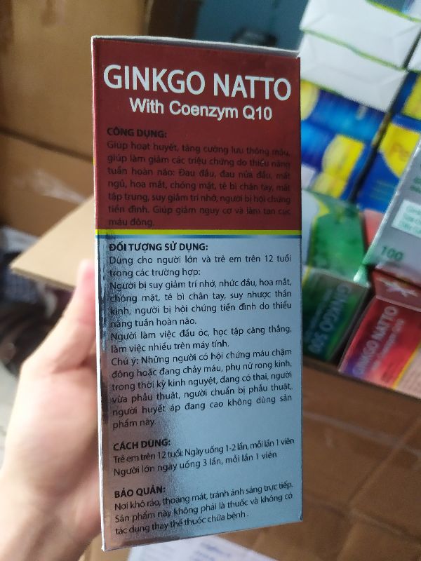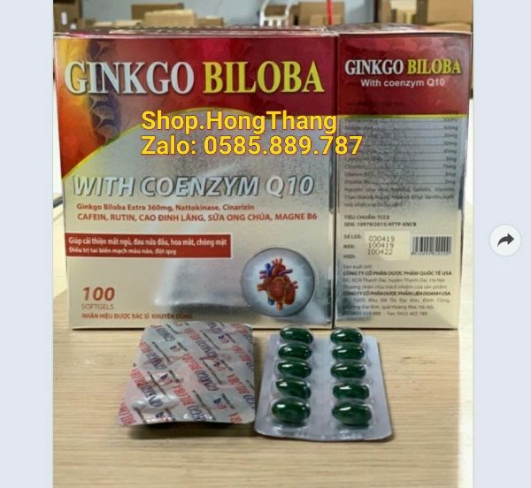 Thành phần:Ginkgo biloba...............360mgNattokinase..................300 FUMagne oxyd..................60mgCao đinh lăng...............30mgCafein...........................30mgSữa ong chúa...............30mgCoenzyme Q10.............3mgVitamin B1.....................3mgVitamin B6.....................3mgDHA Công dụng:Giúp hoạt huyết dưỡng não, bền thành mạchTăng cường lưu thông máu tới các bộ phận cơ thể, giúp làm khỏe tim, , giảm nguy cơ tai biến tim mạch, tai biến mạch máu não.Giảm các triệu chứng các bệnh thiểu năng tuần hoàn não như: mệt mỏi, đau đầu, chóng mặt, hoa mắt, mất thăng bằng, suy giảm trí nhớ, suy nhược thần kinh, thiểu năng tuần hoàn ngoại vi như: đau mỏi vai gáy, tê cứng cổ, tê bì chân tay, đau cơ. Cách dùng:Trẻ em trên 12 tuổi và người lớn: uống 1 viên/lần, 2-3 lần/ngàyQuy cách:Hộp 10 vỉ x 10 viênHạn sử dụng 3 năm.Xuất xứ:Công ty dược phẩm quốc tế USA, Hà Nội.