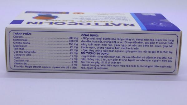 Rối loạn tiền đình là chứng bệnh đang ngày càng phổ biến và tỉ lệ người mắc ngày càng có xu hướng gia tăng. Một nghiên cứu gần đây về dịch tễ học ở Mỹ ước tính 35% người từ 40 tuổi trở lên đã trải qua một số cơn rối loạn tiền đình. Cũng tại Mỹ, Viện Quốc gia về chứng điếc và rối loạn giao tiếp khác (NIDCD) báo cáo 80% những người từ 65 tuổi trở lên thường bị chóng mặt, trong đó chóng mặt do rối loạn tiền đình chiếm khoảng 50%. Mức độ bệnh có thể nhẹ hoặc cũng có thể diễn biến khá nặng và nghiêm trọng tùy từng người bệnh1.THÀNH PHẦN:Citicolin……………….…………200mgNattokinase……………….….…300 FUGinkgo biloba………..………….150mgMagnesium………..……………..20mgTam thất………..………………..20mgCao rau đắng biển……..…20mgCoenzym Q10………………….20mgRutin………..……………………….10mgCao bình vôi………..……..………..5mgVitamin B6………..…….…………..5mg2.CÔNG DỤNG: Giúp hoạt huyết dưỡng não, tăng cường lưu thông máu não, giảm tình trạng đau đầu, hoa mắt, chóng mặt, ù tai, mất ngủ, rối loạn tiền đình, suy giảm trí nhớ do thiểu năng tuần hoàn máu não, giảm nguy cơ mắc các bệnh tim mạch, giúp bền thành mạch, phòng ngừa tai biến mạch máu não.Giúp tăng cường tuần hoàn ngoại vi, giúp giảm đau mỏi vai gáy, tê bì chân tay4. ĐỐI TƯỢNG SỬ DỤNG: Người thiểu năng tuần hoàn não, rối loạn tiền đình có biểu hiện đau đầu, hoa mắt, chóng mặt, ù tai, mất ngủ, suy giảm trí nhớ. Người có tuần hoàn ngoại vi kém gây đau mỏi vai gáy, cổ, tê bì chân tay. Người có nguy cơ tai biến mạch máu não hoặc bị di chứng sau tai biến mạch máu não, người bị parkinson.  5. CÁCH DÙNG:Ngày uống 2 lần, mỗi lần 1-2 viên.Liều duy trì: Ngày uống 1 viênKhuyến cáo: Người đang chảy máu, trước phẫu thuật, phụ nữ có thai tham khảo ý kiến thầy thuốc trước khi dùng.
