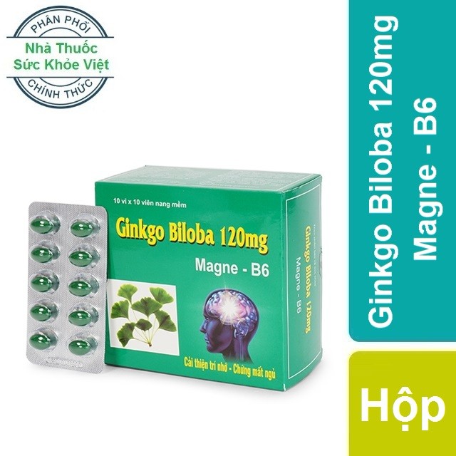 Thành phần:Ginkgo biloba 120 mgMagnesi oxyd 30 mgVitamin B6 1 mgGelatin 160mgSorbitol 3mgSoybean Oil 530mgLecithin 20mgBee wax 20mgVanillin 2mgTá dược vừa đủ 01 viênCông dụng:- Giúp dãn động mạch, tăng co bóp mạch máu, giảm tính thấm thành mạch máu, tăng tuần hoàn não, tăng dung nạp oxy ở não..- Tăng khả năng chú ý tập trung.- Cải thiện tình trạng suy giảm trí nhớ. Hỗ trợ điều trị các hội chúng có liên quan đến thiểu năng tuần hoàn não, rối loạn tâm thần tập tính ở tuổi già (như: giảm trí nhớ, đổi tính..), các rối loạn về mạch ngoại vi của tiểu tuần hoàn, ù tai, chóng mặt, đau đầu, mất ngủ.- Phòng ngừa và làm chậm tiến triển bệnh Alzheimer’s.Đối tượng sử dụng:- Dùng cho các trường hợp thiểu năng tuần hoàn não với các biểu hiện: suy giảm trí nhớ, đau đầu, hoa mắt, chóng mặt, mất ngủ, mất thăng bằng, suy nhược thần kinh.- Người làm việc trí óc căng thẳng, mệt mỏi.- Người bị viêm đau dây thần kinh, rối loạn tuần hoàn ngoại vi gây lạnh chân tay.Cách sử dụng:Người lớn ngày uống 02 lần mỗi lần 01 viên, uống sau ăn.Thời hạn sử dụng: 03 năm kể từ ngày sản xuất.Bảo quản: Nơi khô ráo, tránh ánh sáng.Quy cách đóng gói: Hộp 10 vỉ x 10 viên nangSĐK: 4678/2013/ATTP-XNCBSản phẩm này không phải là thuốc, không có tác dụng thay thế thuốc chữa bệnh.