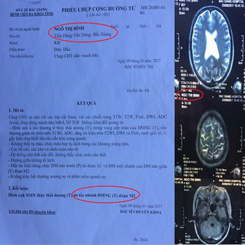 Sau chụp chiếu, bác sỹ kết luận nhồi máu não, tai biến thể nhẹ do tắc nhánh ĐMNG(T) đoạn M2. Ông Ninh rất bất ngờ, dường như suy sụp từ đấy.Tuy ngoài miệng dặn dò con cháu cứ yên tâm đi làm, mẹ đã có bố chăm nhưng trong lòng ông không lúc nào yên. Sau 10 ngày nằm viện, tình trạng bà được coi là tạm ổn, ông thu xếp thủ tục cho bà ra viện rồi về tìm giải pháp điều trị tiếp theo. Trở về nhà bà tiếp tục sử dụng liều thuốc tiêm 150.000/ lọ nhưng hệ vận động ngôn ngữ, tay chân vẫn chưa hồi phục, đầu đau từng mảng, toàn thân mệt mỏi ăn không ngon ngủ không yên.