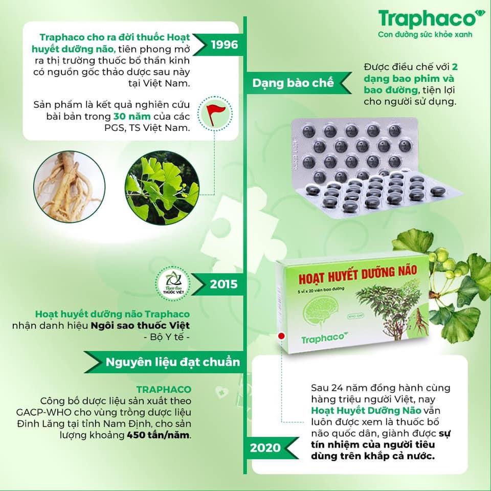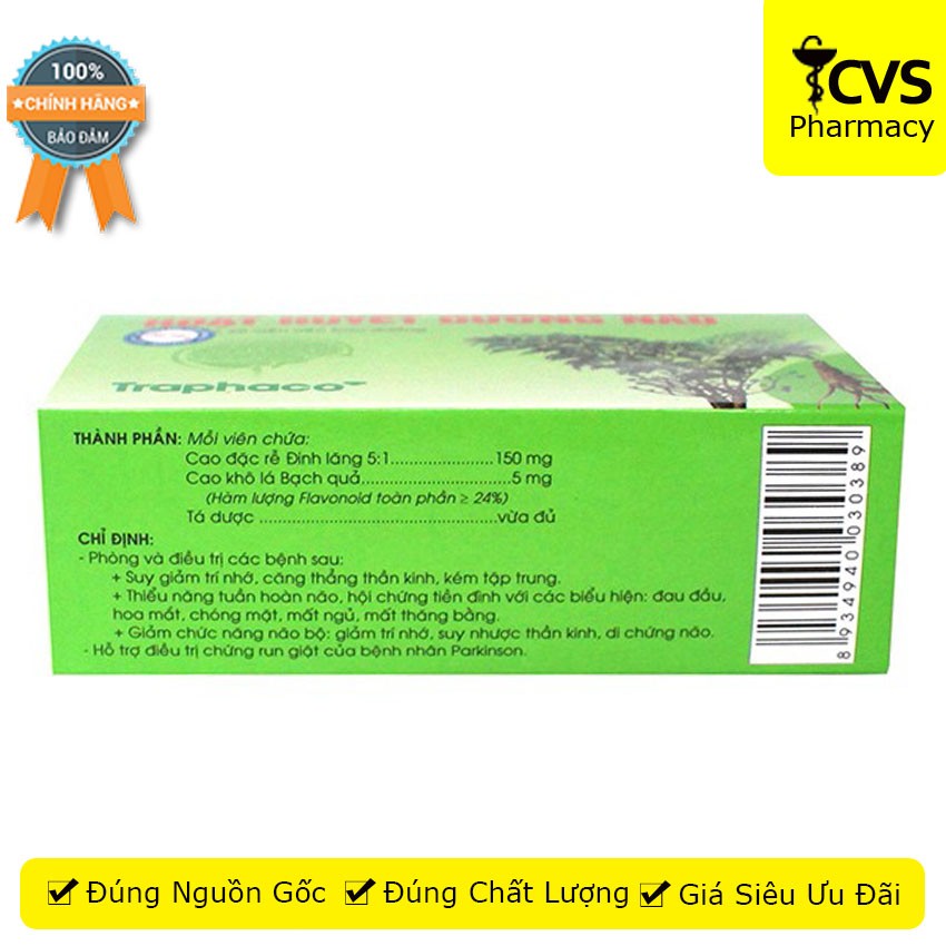 Hoạt Huyết Dưỡng Não TraphacoNhà sản xuất: Công Ty CP Công Nghệ Cao TraphacoXuất xứ: Việt NamGiấy phép: VD-19621-13Quy cách 90.000đ