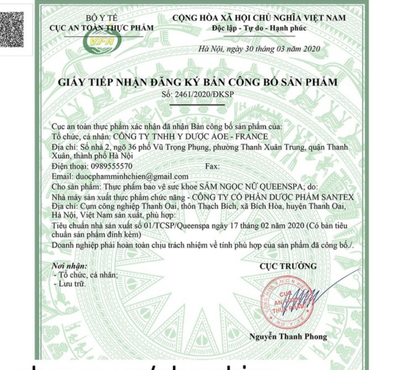 - Được Bộ Y Tế cấp phép sản xuất số: 2461/2020/ĐKSP