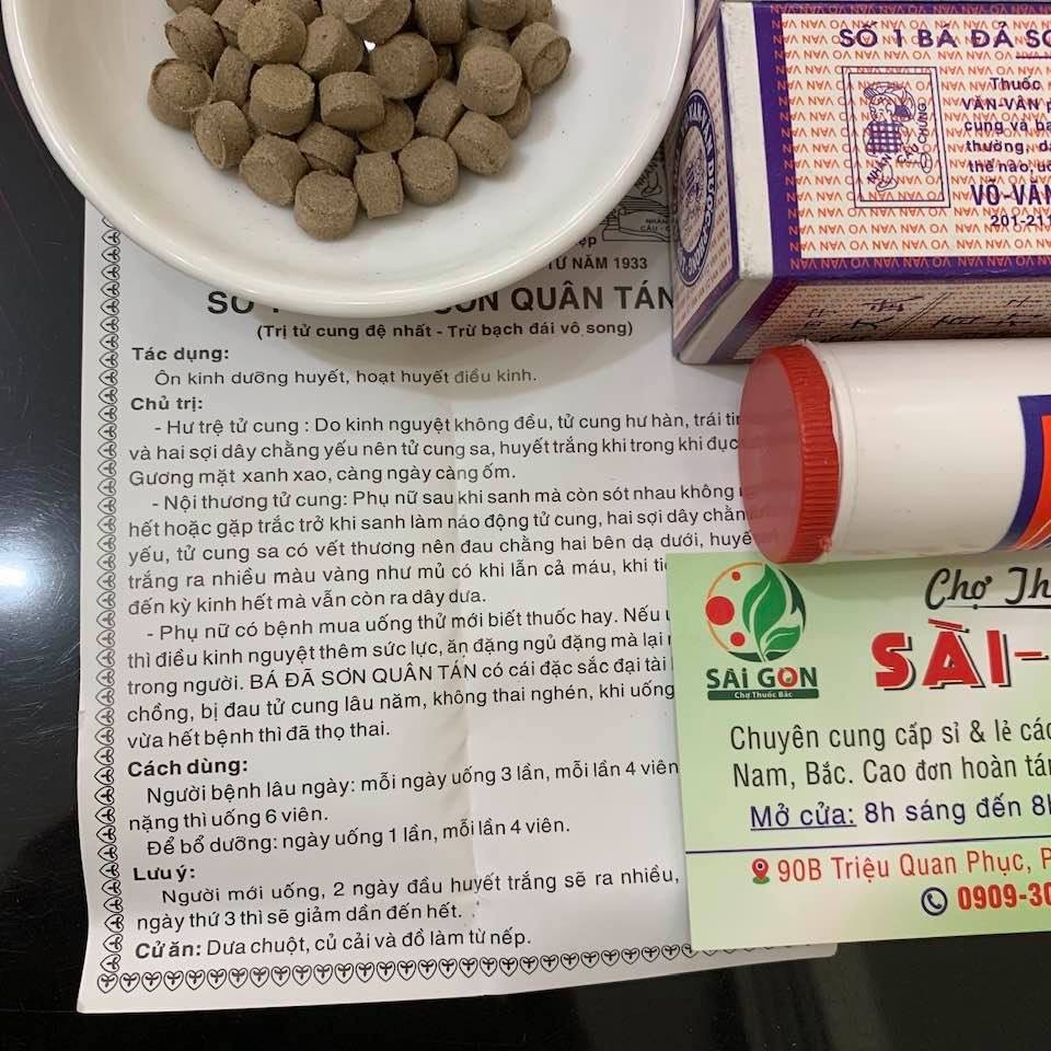 Tác dụng: Ôn kinh dưỡng huyết, hoạt huyết điều kinhCông dụng: BÁ ĐÃ SƠ QUÂN TÁN• Hư trệ tử cung: Do kinh nguyệt không đều, tử cung hư hàn, trái tim và hai sợ dây chằng yếu nên tử cung sa, huyết trắng khi trong khi đục. Gương mặt xanh sao, càng ngày càng ốm.• Nội thương tử cung: Phụ nữ sau khi sanh mà còn sót nhau không ra hết hoặc gặp trắc trở khi sanh làm náo động tử cung, hai sợ dây chằng yếu, tử cung sa có vết thương nên đau chằng hai bên dạ dưới, huyết trắng ra nhiều màu vàng như mủ có khi lẫn cả máu, khi tiểu đau rát, đến kỳ kinh hết mà vẫn còn ra dây dưa.• Phụ nữ có bệnh mua uống thử mới biết thuốc hay. Nếu uống nhiều thì điều kinh nguyệt thêm sức lực, ăn đặng ngủ đặng mà lại mạnh khoẻ trong người. BÁ ĐÃ SƠ QUÂN TÁN có cái đặc sắc đại tài là người có chồng, bị đau tử cung lâu năm, không thai nghén, khi uống thuốc này vừa hết bệnh thì đã thọ thai.Cách dùng: BÁ ĐÃ SƠ QUÂN TÁN• Người bệ.nh lâu ngày: mỗi ngày uống 3 lần, mỗi lần 4 viên, nếu bệnh nặng thì uống 6 viên.• Để bổ dưỡng: ngày uống 1 lần, mỗi lần 4 viênLưu ý: BÁ ĐÃ SƠ QUÂN TÁN• Người mới uống, 2 ngày đầu huyết trắng sẽ ra nhiều, nhưng đến ngày thứ 3 thì sẽ giảm dần đến hết.• Cử ăn: dưa chuột, củ cải và đồ làm từ nếp