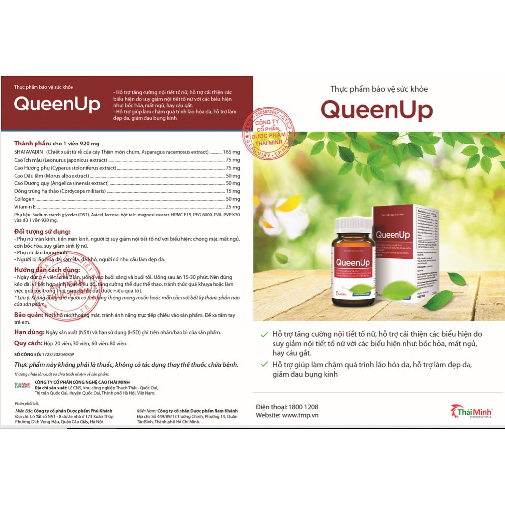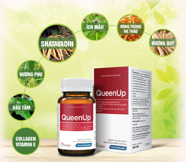 THÀNH PHẦN: Mỗi viên Queenup chứa:Shatavadin®:….....................165mgCao Ích mẫu:……................…75mgCao Hương phụ: ….............…75mgCao Dâu tằm: …......................50mgCao Đương Quy: ….......……..50mgĐông trùng hạ thảo:.................15mgCollagen: ………………......….50mgVitamin E: …………….............25mg