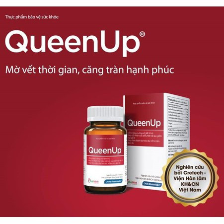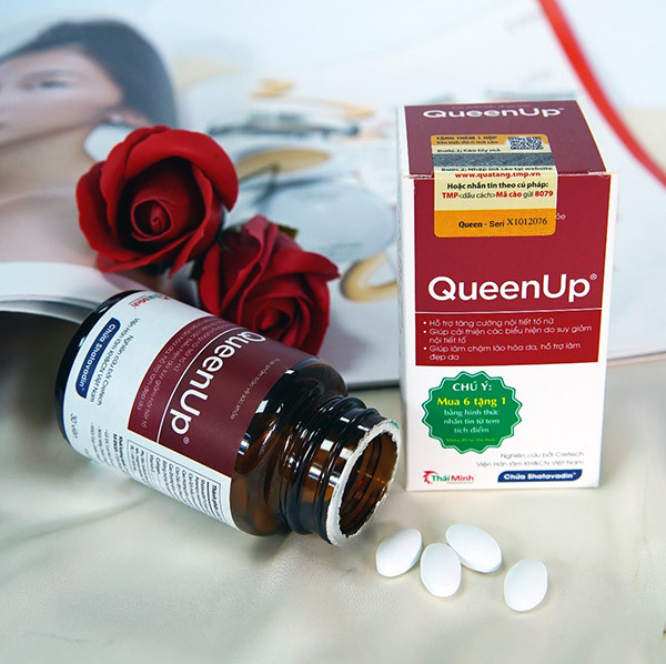 CÔNG DỤNGĐược sản xuất với dây chuyền công nghệ hiện đại đạt chuẩn GPM, QueenUp mang đến các hiệu quả vượt trội:- Hỗ trợ tăng cường nội tiết tố nữ.- Cải thiện các biểu hiện do suy giảm nội tiết tố nữ như: bốc hỏa, mất ngủ, hay cáu gắt.- Giúp giảm đau bụng kinh, điều kinh.- Giúp làm chậm lão hóa da, làm đẹp da.