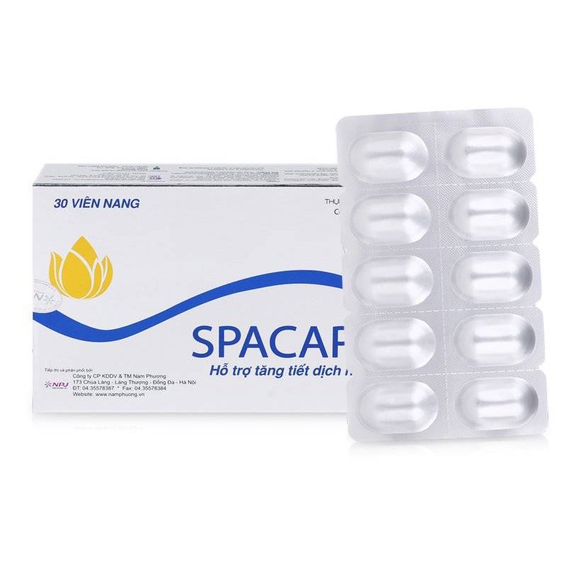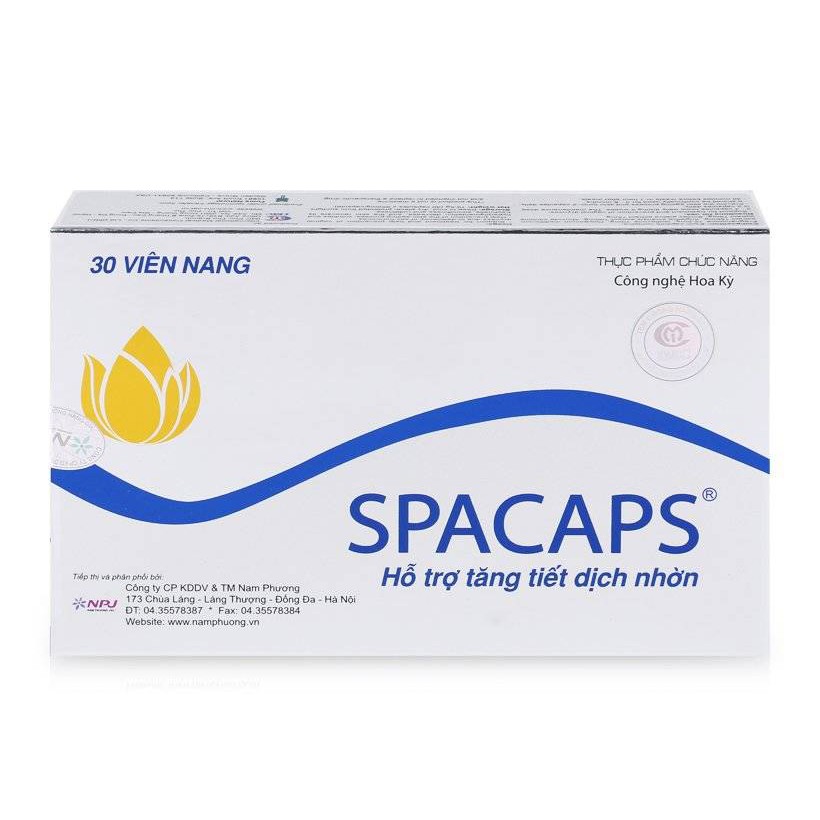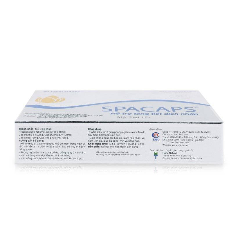 Thực phẩm chức năng hỗ trợ tăng tiết dịch nhờn Spacaps là sản phẩm có nguồn gốc từ thiên nhiên kết hợp giữa Pregnenolone - một chất tiền hoóc môn chiết xuất từ củ mài và Isoflavone - một loại Estrogen thực vật chiết xuất từ đậu nành cùng nhiều loại thảo dược quý như cao hà thủ ô, cao đương quy, cao nhàu, cao thổ phục linh giúp tăng cường, khôi phục cân bằng hoóc môn cơ thể và từ đó hỗ trợ điều trị, phòng ngừa chứng khô âm đạo, giảm viêm nhiễm vùng sinh dục nữ và các biểu hiện do rối loạn nội tiết tố nữ. Ngoài ra, sản phẩm còn có khả năng phòng ngừa lão hóa da, giảm nếp nhăn, sạm nám, giúp da sáng bóng, căng mịn và hồng hào.