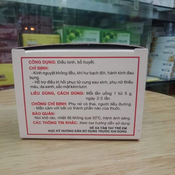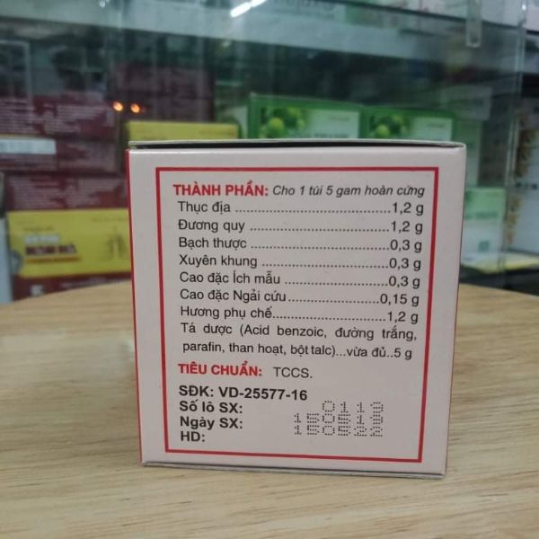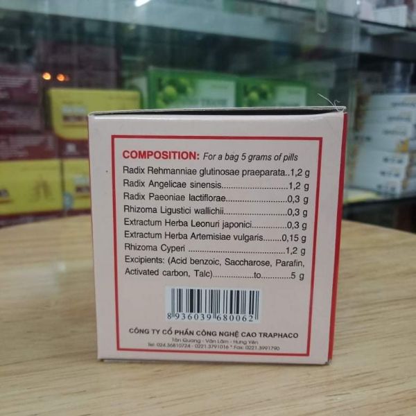 Nội dung:Trình bày:Viên hoàn cứng, Hộp 10 gói x 5gThành phầnThục địa, Đương qui, Bạch thược, Xuyên khung, Ích mẫu, Ngải cứu, Hương phụTá dược vừa đủChỉ địnhDùng trong các trường hợp:- Kinh nguyệt không đều.- Hành kinh đau bụng, băng huyết, rong huyết.- Khí hư bạch đới.- Hồi phục tử cung sau khi sinh.- Phụ nữ thiếu máu, da xanh, sắc mặt kém tươi.Liều dùng, cách dùng- Uống mỗi lần 1 gói, ngày 2-3 lần.- Uống 10 ngày liền trước khi thấy kinh và uống trong 2-3 vòng kinh liên tiếp.Chống chỉ định- Mẫn cảm với bất cứ thành phần nào của thuốc.- Phụ nữ có thaiHạn sử dụng: 36 thángChứng nhận: TCCS