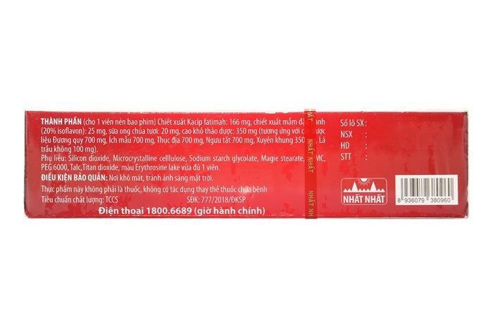 Chiết xuất Kacip fatimah: 166mg, chiết xuất mầm đậu nành (20% isoflavon): 25mg, sữa ong chúa tươi: 20mg, cao khô thảo dược: 350mg (tương ứng với các dược liệu Đương quy 700mg, Ích mẫu 700mg, Thục địa 700mg, Ngưu tất 700mg, Xuyên khung 350mg, Lá trầu không 100mg).