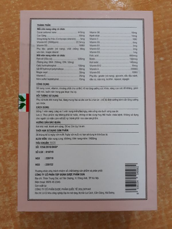 Công dụng:bổ sung canxi ,vitamin khoáng chất cho cơ thể, để hỗ trợ tăng cường sức khỏe ,nâng cao sức đề kháng, giảm mệt mỏi ,buồn nôn trong giai đoạn thai kỳ.Đối tượng sử dụng: phụ nữ trước khi mang thai, đang mang thai và cho con bú chán ăn, chế độ dinh dưỡng kém cần tăng cường sức khỏe .Cách dùng: uống 1 viên nang cứng và 1 viên nang mềm lần/ ngày nên uống vào buổi sáng sau ăn. lưu ý :thực phẩm này không phải là thuốc không có tác dụng thay thế thuốc chữabệnh. không sử dụng cho người có mẫn cảm với bất kỳ thành phần nào của sản phẩm. Hướng dẫn bảo quản: Nơi khô mát ,tránh Ánh Sáng để xa tầm tay trẻ em .Thời hạn sử dụng sản phẩm: 36 tháng kể từ ngày sản xuất .Ngày sản xuất và hạn sử dụng in trên bao bì .khối lượng trung bình viên viên nang cứng :650mg ;viên nang mềm: 1400mg thương nhân chịu trách nhiệm về chất lượng sản phẩm và phân phối: công ty Cổ phần Tập đoàn dược phẩm Sun.