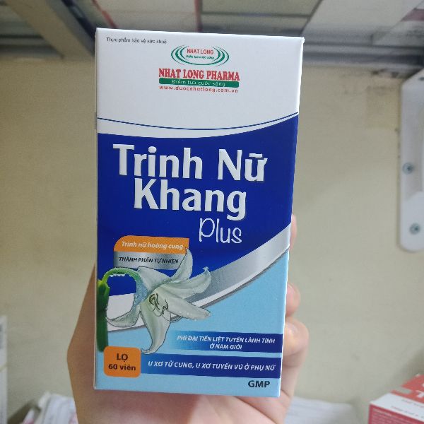 Quy cách đóng gói Hộp gồm 1 lọ x 60 viên Hướng dẫn sử dụng Uống 2 viên/ lần x 2 lần/ ngày, sau ăn 1 giờ. Phòng bệnh: uống 1 viên/ lần/ ngày, sau ăn 1 giờ. Nên sử dụng liên tục 4- 6 tháng Dừng uống nếu mẫn cảm với một trong các thành phần của sản phẩm. Hướng dẫn bảo quản Bảo quản nơi khô ráo, thoáng mát Thương hiệu Công ty Cổ Phần Dược Phẩm SANTEX Sản xuất tại Việt Nam MÔ TẢ SẢN PHẨM 1. Thành phần Trinh Nữ Khang Plus Cao Trinh nữ hoàng cung 200mg; Cao Bạch Hoa Xà thiệt thảo 80mg; Cao Xạ đen 60mg; Tinh chất nghệ (nanocurcumin) 50mg; Bột tam thất 50mg; Cao bán chi liên 40mg. Phụ liệu: Lactose, talc, vừa đủ 1 viên. 2. Công dụng Trinh Nữ Khang Plus Hỗ trợ làm giảm u xơ tử cung, u nang buồng trứng, u vú lành tính. Giúp bổ huyết điều kinh ở nữ giới. Hỗ trợ làm giảm u xơ, phì đại tiền liệt tuyến lành tính, tiểu tiện khó ở nam giới. 3. Đối tượng sử dụng Trinh Nữ Khang Plus Phụ nữ u nang buồng trứng, u xơ tử cung, u vú lành tính. Nam giới phì đại tuyến tiền liệt lành tính dẫn đến tiểu tiện khó, tiểu đêm nhiều lần. Chú ý: Sản phẩm này là thực phẩm chức năng, không phải thuốc, không có tác dụng thay thế thuốc chữa bệnh. Đọc kỹ hướng dẫn trước khi sử dụng.