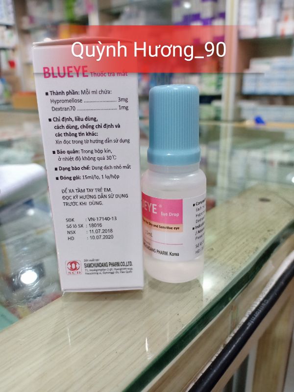 Thành phần thuốc Blueye: Hypromellose 3mg, Dextran70 1mgCông dụng: Blueye là nước mắt nhân tạoChỉ định dùng thuốc Blueye: Dùng làm dịu đi các cảm giác mắt khô, cay, xốn ngứa, cộm như có bụi trong măt, mỏi mắt, đỏ mắt do lượng nước mắt tiết ra không đủCách dùng Blueye: Thuốc chỉ dùng nhỏ mắt, Nhỏ 1 đến 2 giọt, số lần nhỏ tùy theo triệu chứng.Quy cách đóng gói: Hộp 1 lọ 15mlNhà sản xuất: Samchundang Pharm, Korea