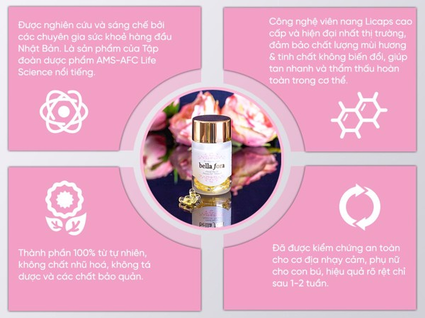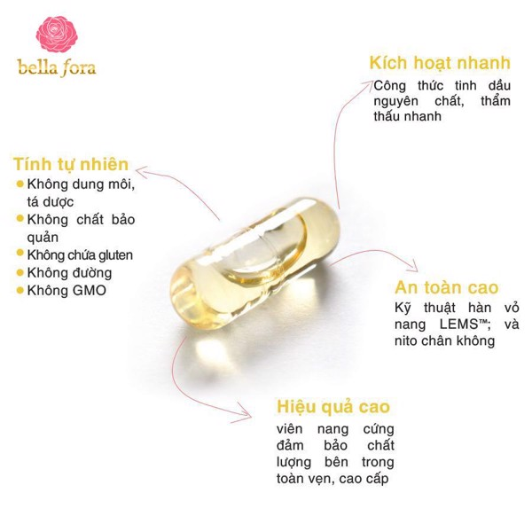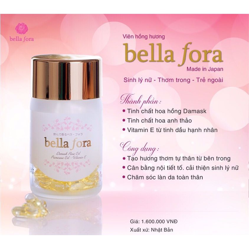 Viên uống Bella Fora xuất xứ Nhật Bản với tinh chất từ hoa hồng Damask, hoa Anh Thảo và vitamin E có trong hạt hạnh nhân giúp cải thiện nội tiết tố, cân bằng sinh lý nữ, nhờ đó ngăn chặn tối đa tình trạng nám sạm da, làm chậm quá trình lão hóa và nuôi dưỡng làn da trắng khỏe, căng bóng từ bên trong.