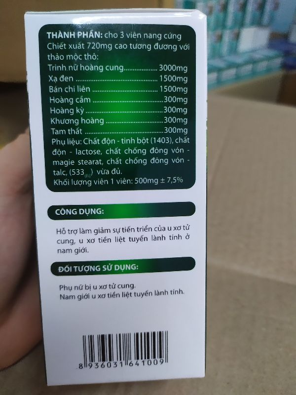 ❤ Trinh Nữ Hoàng Cung – Hỗ trợ điều trị u xơ tử cung, u nang buồng trứng, u xơ tuyến tiền liệt✳ THÀNH PHẦN:• Cao Trinh nữ hoàng cung (Crinum latifolium)• Cao Xạ đen• Cao Hoàng Cầm • Cao Hoàng Kỳ • Nghệ • Cao Tam thất (Radix Panasis notoginseng• Phụ liệu: Lactose, Tinh bột ngô, Natri starch glycolat, Magnesi stearat, Aerosil.✳ CÔNG DỤNG:• Giúp tăng cường sức đề kháng, tăng khả năng miễn dịch của cơ thể• Hỗ trợ điều trị và phòng ngừa các bệnh: U xơ tuyến vú, u xơ tử cung, u nang buồng trứng, rối loạn kinh nguyệt đối với phụ nữ• Hỗ trợ điều trị và phòng ngừa u xơ tuyến tiền liệt ở nam giới ✳ ĐỐI TƯỢNG SỬ DỤNG:• Người bị suy giảm khả năng miễn dịch• Người bị phì đại tuyến tiền liệt lành tính, tiểu tiện khó khăn• Người bị u xơ tử cung, u nang buồng trứng, u xơ tuyến vú, rối loạn kinh nguyệt✳ CÁCH DÙNG:• Phòng bệnh và tăng cường sức đề kháng: Uống 2 viên/lần, 2 lần/ngày, sau bữa ăn 1 giờ• Hỗ trợ điều trị các bệnh u xơ tuyến vú, u nang buồng trứng, u xơ tử cung: Uống 3 viên/lần, 3 lần/ngày, sau bữa ăn 1 giờ• Hỗ trợ điều trị các bệnh u xơ tuyến tiền liệt ở nam giới: Uống 3 viên/lần, 3 lần/ngày, sau bữa ăn 1 giờ• Sử dụng liên tục từ 2-3 tháng để có kết quả điều trị tốt nhất✳ QUY CÁCH SẢN PHẨM:• Hộp 1 lọ x 60 viên✳ HẠN SỬ DỤNG: • Xem trên bao bì sản phẩm✳ LƯU Ý: SẢN PHẨM NÀY KHÔNG PHẢI LÀ THUỐC VÀ KHÔNG CÓ TÁC DỤNG THAY THẾ THUỐC CHỮA BỆNH !!!#trinhnuhoangcung #u-xơ_tử_cung, #u_nang_buồng_trứng, #u_xơ_tuyến_tiền_liệt #tuyen_vu #buong_trung
