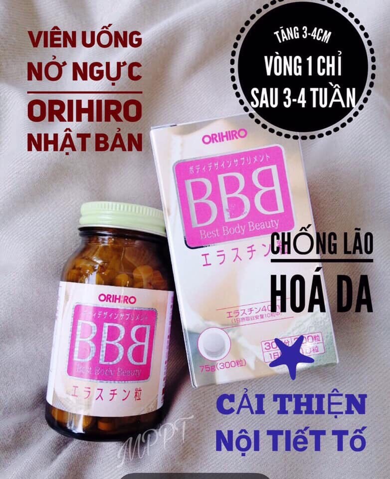 - Viên uống nở ngực BBB Orihiro đem lại làn da sáng hồng, mái tóc khỏe và làm chậm quá trình lão hóa