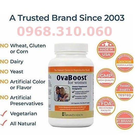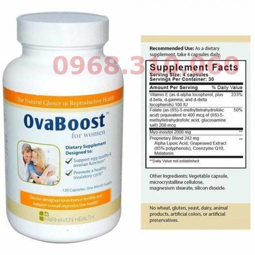 Việc tiếp xúc thường xuyên với chất độc trong môi trường sống, stress, ăn uống không khoa học, mất cân bằng nội tiết, phẫu thuật buồng trứng... đều ảnh hưởng đến chất lượng trứng, làm giảm khả năng thụ thai. Chất lượng trứng kém có thể dẫn đến khó thụ thai ở một số mặt. Khi chất lượng trứng giảm, tinh trùng khó có khả năng xâm nhập và kết hợp với trứng; việc làm tổ của trứng đã được thụ tinh cũng khó thành công; và sảy thai cũng dễ xảy ra do bất thường nhiễm sắc thể.Công dụng Fairhaven Health OvaBoost for WomenMặc dù không tăng được số lượng trứng, nhưng chất lượng trứng có thể được nâng cao. Các nghiên cứu đã chỉ ra rằng tế bào trứng rất dễ bị ảnh hưởng bởi các gốc tự do, những phân tử oxy không bền hình thành khi cơ thể phá hủy các chất độc. Và để các chức năng được hoàn thiện, trứng cũng cần có một nguồn năng lượng to lớn. Fairhaven Health OvaBoost for Women được nghiên cứu và phát triển bởi một nhóm chuyên gia y tế. Công thức của Fairhaven Health OvaBoost for Women bao gồm các thành phần chủ chốt giúp bảo vệ trứng khỏi tác động gây hại của các gốc tự do, đồng thời giúp tế bào trứng sản sinh năng lượng cần thiết cho quá trình thụ thai và làm tổ của phôi. Kết hợp một số chất chống oxi hóa để bảo vệ tế bào trứng khỏi tổn thương do các gốc tự do.Chứa CoQ10 giúp trứng sản sinh năng lượng cho các hoạt động cần thiết.Công thức được các bác sĩ tạo ra để tăng chất lượng trứng và hỗ trợ chức năng buồng trứng ở tất cả các phụ nữ dự định có con.Không chứa bột mỳ, gluten, nấm men, đậu nành, sản phẩm từ sữa, sản phẩm từ động vật, màu nhân tạo và chất bảo quản nhân tạo.Đặc biệt khuyên dùng cho các phụ nữ lớn tuổi hoặc các phụ nữ bị buồng trứng đa nang.Có thể dùng đồng thời với FertilAid for Women và FertileCM for Women.Sản xuất tại Mỹ dưới cơ sở đạt chứng nhận GMP.Thành phần Fairhaven Health OvaBoost for WomenCông thức đặc biệt nổi bật nhờ chứa 3 thành phần myo-inositol, folic acid, và melatonin; là những thành phần đã được khoa học chứng minh giúp tăng chất lượng trứng. Tất nhiên folic acid đã được biết đến nhờ khả năng tránh dị dạng ống thần kinh và được khuyên dùng cho tất cả các phụ nữ độ tuổi sinh đẻ. Nhưng những nghiên cứu gần đây chỉ ra rằng khi folic acid được dùng cùng với 2 chất chống oxy hóa mạnh khác là myo-inositol và melatonin với tỷ lệ đúng, chất lượng trứng được cải thiện rõ rệt ở những phụ nữ sử dụng phương pháp IVF. Nghiên cứu gần đây cũng khẳng định thêm rằng myo-inositol làm cải thiện độ nhạy insulin, vì vậy giúp chức năng buồng trứng đạt hiệu quả tối đa và giúp ổn định chu kỳ ở những người buồng trứng đa nang.Thêm vào đó, OvaBoost chứa Coenzyme Q10 (CoQ10), cũng là một chất chống oxy hóa mạnh. CoQ10 cũng đóng vai trò quan trọng trong việc sản sinh năng lượng trong tế bào trứng. Khi sự thụ thai xảy ra, sự phân chia tế bào xảy ra để trứng phát triển thành phôi và làm tổ thành công vào thành tử cung cần một nguồn năng lượng dồi dào. CoQ10 trong ty thể (cơ quan sản sinh năng lượng của tế bào) của trứng giúp duy trì sự sản sinh năng lượng ổn định và hiệu quả.Cuối cùng, OvaBoost chứa thêm 3 thành phần chống oxy hóa: Vitamin E, chiết xuất hạt nho và alpha lipoic acid, để đủ sự bảo vệ, giữ tế bào trứng khỏi các tổn thương do các gốc tự do. Đối tượng sử dụng Fairhaven Health OvaBoost for Women