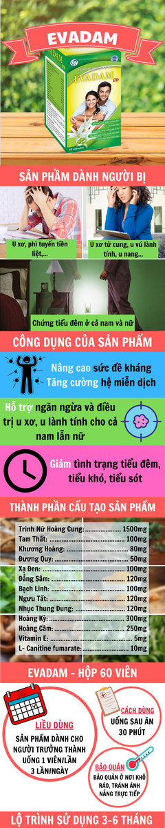 EVADAM - Hỗ trợ giảm u vú, u nang buồng trứng, u xơ tử cung ở phụ nữ, u xơ phì đại lành tính tuyến tiền liệt ở nam giới, tiểu tiện khó khăn, tiểu nhiều lần, tiểu sót. (hộp 60 viên)