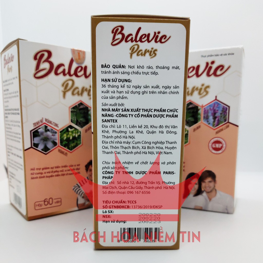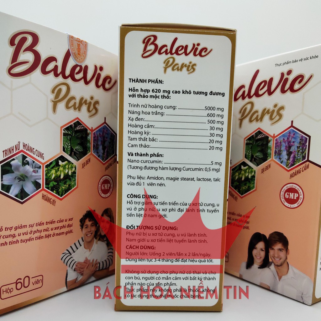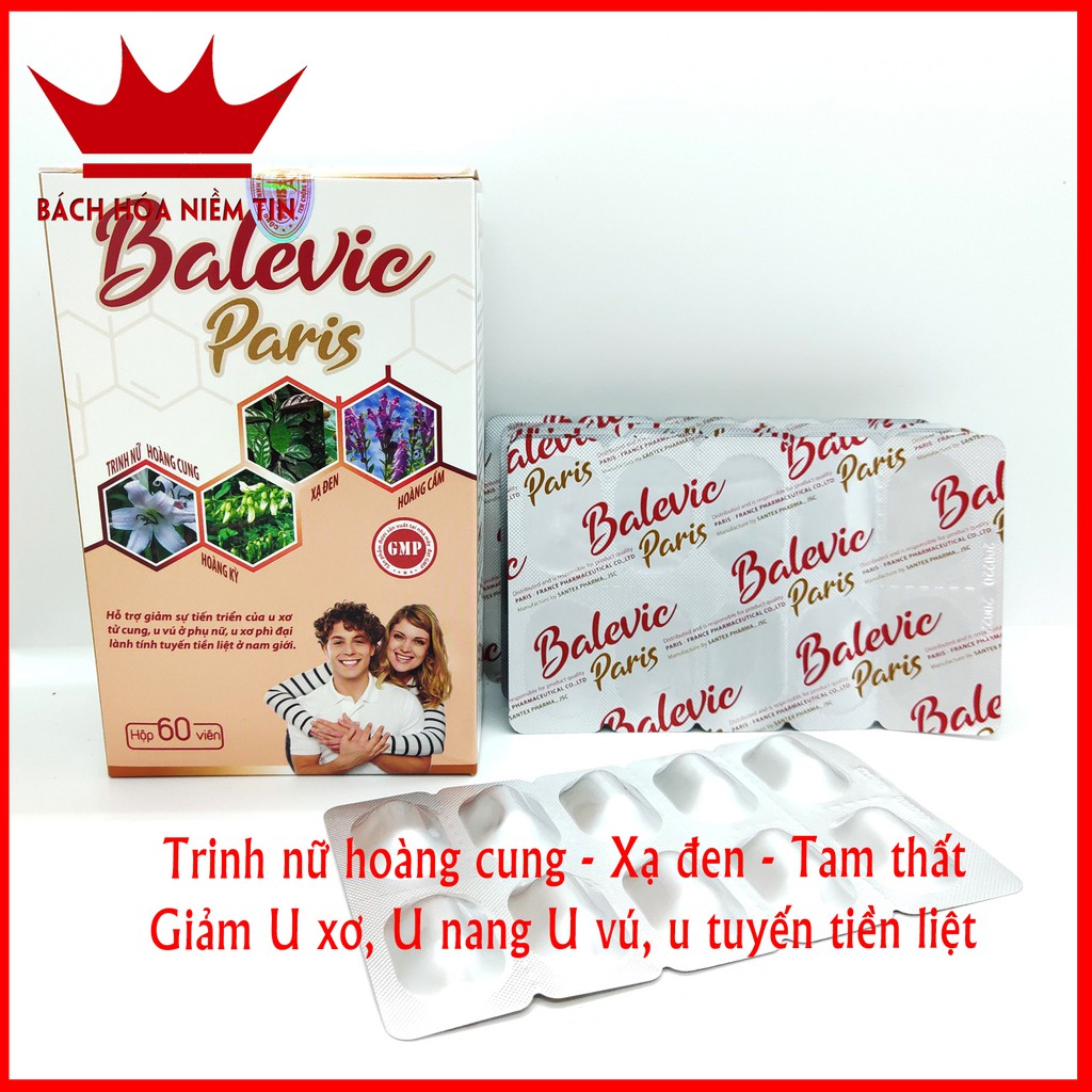 Thảo dược tự nhiên: Trinh nữ hoàng cung, náng hoa trắng, Xạ đen, Hoàng Cầm, Hoàng Kỳ, Tam Thất, Cam thảo, Nano Curcumin an toàn hiệu quảHỗ trợ giảm sự tiến triển của U xơ, U vúHộp 60 viên nén- dễ sử dụng, hiệu quả caoMã vạch kiểm tra chính hãng bằng Icheck - tiện dụngSản xuất theo chuẩn GMP bộ y tếĐược Bộ y tế cấp phép theo công bố số: 13736/2019/ĐKSPViên uống Balevic Paris - với thành phần từ các thảo dược quý- Sản xuất theo chuẩn GMP Bộ Y tế- Hiệu quả - an Toàn khi sử dụng lâu dàiTrinh Nữ hoàng kết hợp Tam Thất, Hoàng Kỳ, Xạ đen và các thảo dược quý khác vốn đã được dân gian sử dụng hiệu quả trong việc ngăn ngừa và hạn chế sự phát triển của U vú, U nang buồng trứng, U xơ cổ tử cung và U xơ tuyến tiền liệt ở nam giới, và được kiểm chứng qua nhiều năm. Nay được bào chế theo chuẩn GMP- loại bỏ các tác dụng phụ, các tạp chất, giúp BALEVIC PARIS đạt hiệu quả cao nhất, an toàn cho sự dụng lâu dài.SỬ DỤNG HIỆU QUẢ cho các trường hợp:Phụ nữ bị u xơ tử cung, U vú lành tínhNam giới u xơ tiền liệt tuyến lành tínhTHÀNH PHẦN:Trinh nữ hoàng cung..................5000mgNáng hoa trắng...........................600mgXạ đen.........................................500mgHoàng cầm...................................30mgHoàng kỳ.......................................30mgTam thất bắc..................................20mgCam thảo.......................................20mgNano Curcumin.............................5mgPhụ liệu: Amidon, magie stearat.... vừa đủ 1 viên nénCÔNG DỤNG:Hỗ trợ giảm sự tiến triển của u xơ tử cung, U vú ở phụ nữ Giảm sự tiến triển của U xơ phì đại lành tính tuyến tiền liệt ở nam giớiCÁCH DÙNG:Người lớn: uống 2 viên/lần x 2 lần/ngàyDùng liên tục 3-4 tháng để đạt hiệu quả tốt nhấtKhông sử dụng cho phụ nữ có thai và cho con bú, người mẫn cảm với bất kỳ thành phần nào của sản phẩmĐược bộ Y tế cấp phépMua tại BÁCH HÓA NIỀM TIN để nhận hàng CHÍNH HÃNG#uvu #uxotucung #utienliettuyen #trinhnuhoangcung #xaden #tamthat #phaidep #ungthu #nguaungthu