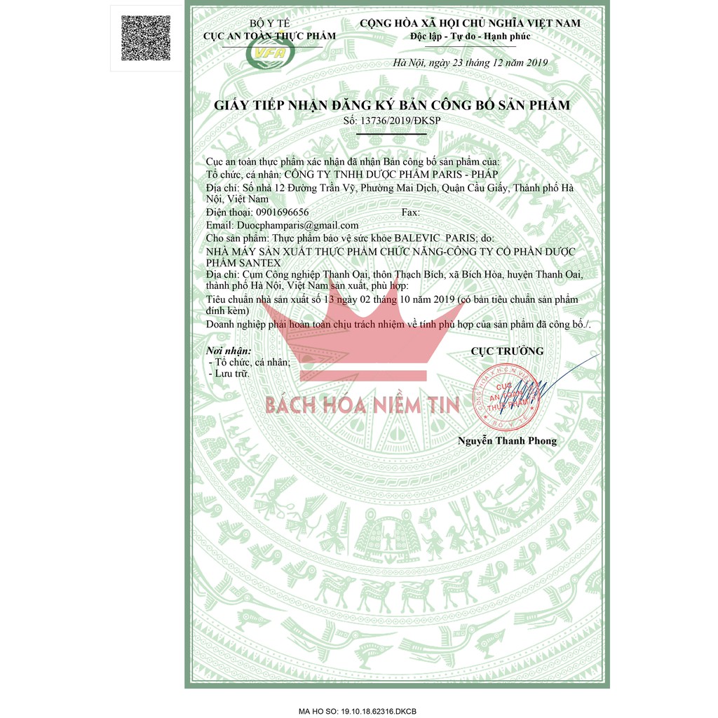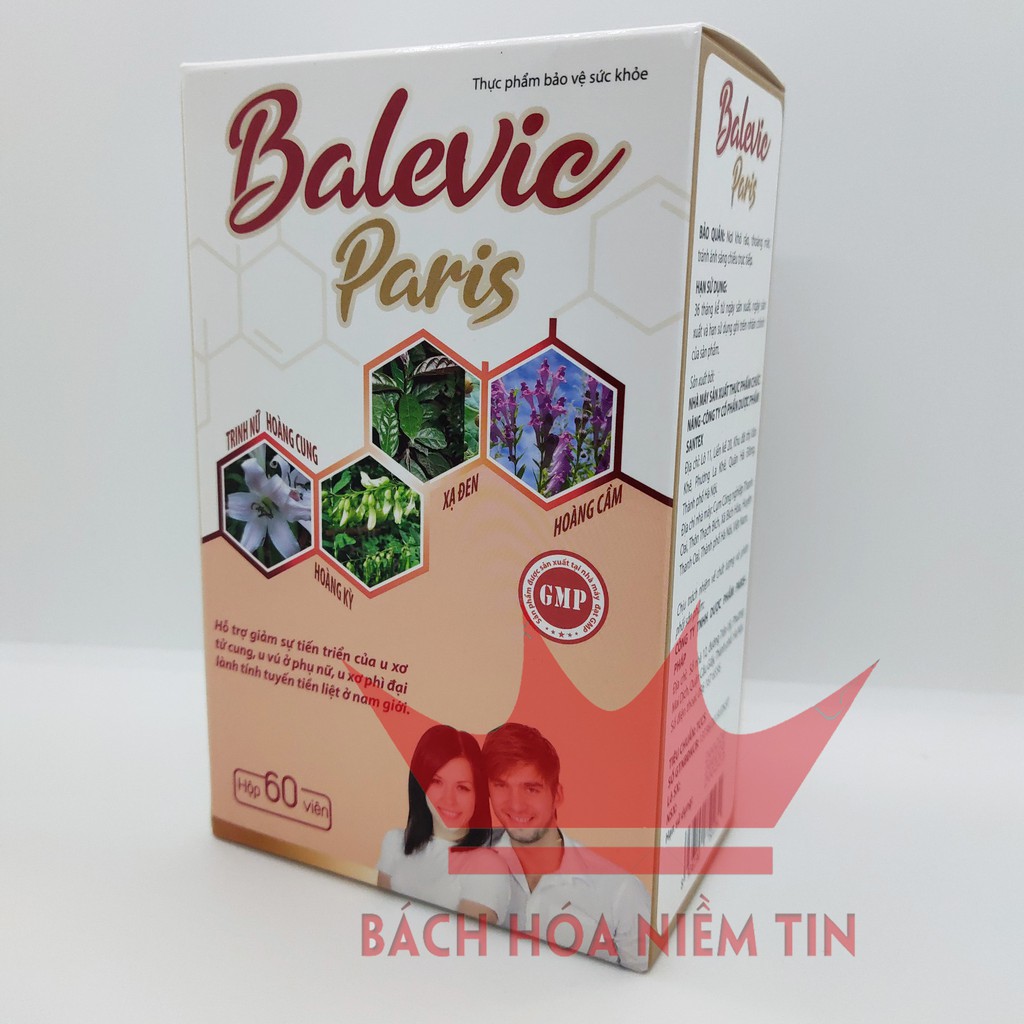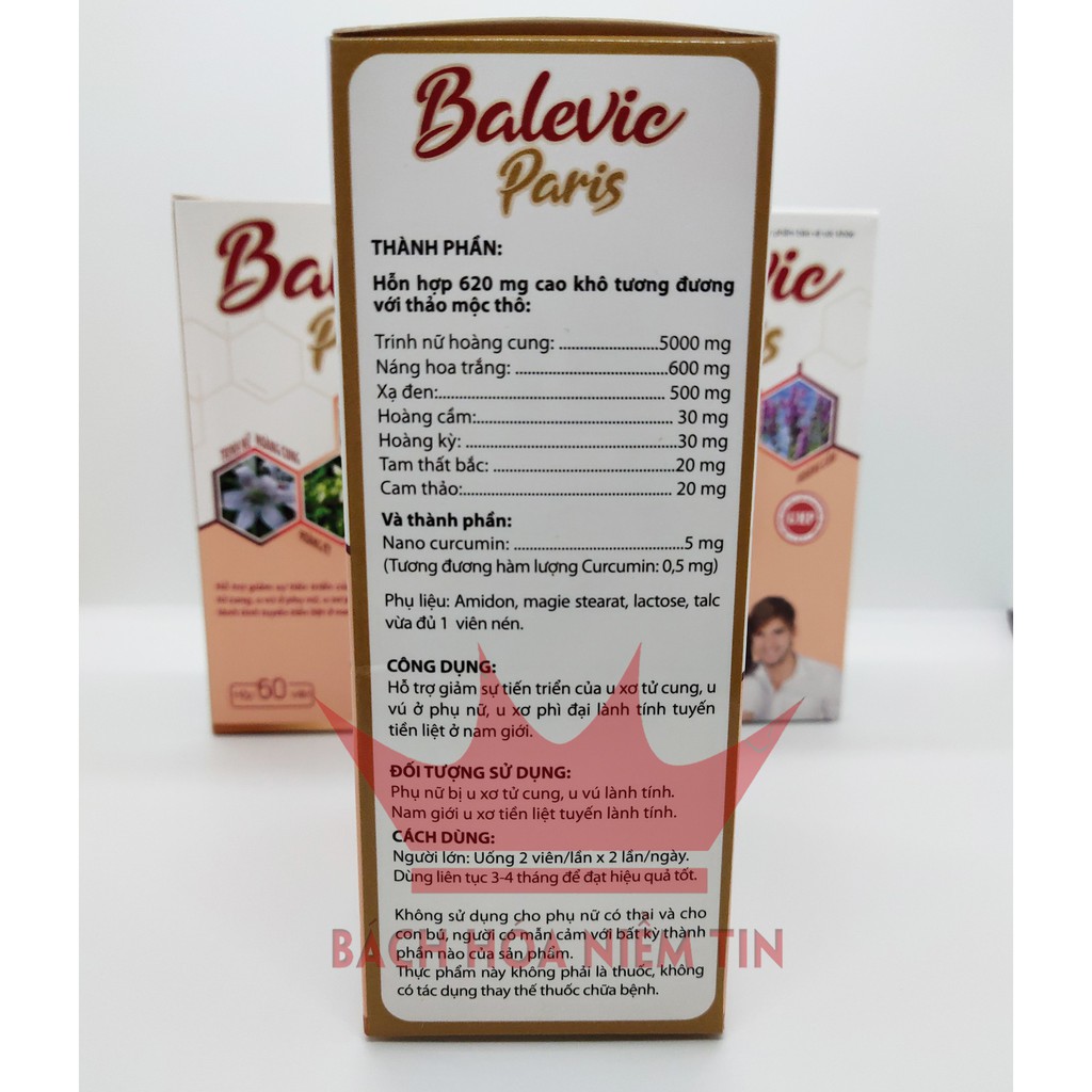 Thảo dược tự nhiên: Trinh nữ hoàng cung, náng hoa trắng, Xạ đen, Hoàng Cầm, Hoàng Kỳ, Tam Thất, Cam thảo, Nano Curcumin an toàn hiệu quảHỗ trợ giảm sự tiến triển của U xơ, U vúHộp 60 viên nén- dễ sử dụng, hiệu quả caoMã vạch kiểm tra chính hãng bằng Icheck - tiện dụngSản xuất theo chuẩn GMP bộ y tếĐược Bộ y tế cấp phép theo công bố số: 13736/2019/ĐKSPViên uống Balevic Paris - với thành phần từ các thảo dược quý- Sản xuất theo chuẩn GMP Bộ Y tế- Hiệu quả - an Toàn khi sử dụng lâu dàiTrinh Nữ hoàng kết hợp Tam Thất, Hoàng Kỳ, Xạ đen và các thảo dược quý khác vốn đã được dân gian sử dụng hiệu quả trong việc ngăn ngừa và hạn chế sự phát triển của U vú, U nang buồng trứng, U xơ cổ tử cung và U xơ tuyến tiền liệt ở nam giới, và được kiểm chứng qua nhiều năm. Nay được bào chế theo chuẩn GMP- loại bỏ các tác dụng phụ, các tạp chất, giúp BALEVIC PARIS đạt hiệu quả cao nhất, an toàn cho sự dụng lâu dài.SỬ DỤNG HIỆU QUẢ cho các trường hợp:Phụ nữ bị u xơ tử cung, U vú lành tínhNam giới u xơ tiền liệt tuyến lành tínhTHÀNH PHẦN:Trinh nữ hoàng cung..................5000mgNáng hoa trắng...........................600mgXạ đen.........................................500mgHoàng cầm...................................30mgHoàng kỳ.......................................30mgTam thất bắc..................................20mgCam thảo.......................................20mgNano Curcumin.............................5mgPhụ liệu: Amidon, magie stearat.... vừa đủ 1 viên nénCÔNG DỤNG:Hỗ trợ giảm sự tiến triển của u xơ tử cung, U vú ở phụ nữ Giảm sự tiến triển của U xơ phì đại lành tính tuyến tiền liệt ở nam giớiCÁCH DÙNG:Người lớn: uống 2 viên/lần x 2 lần/ngàyDùng liên tục 3-4 tháng để đạt hiệu quả tốt nhấtKhông sử dụng cho phụ nữ có thai và cho con bú, người mẫn cảm với bất kỳ thành phần nào của sản phẩmĐược bộ Y tế cấp phépMua tại BÁCH HÓA NIỀM TIN để nhận hàng CHÍNH HÃNG#uvu #uxotucung #utienliettuyen #trinhnuhoangcung #xaden #tamthat #phaidep #ungthu #nguaungthu