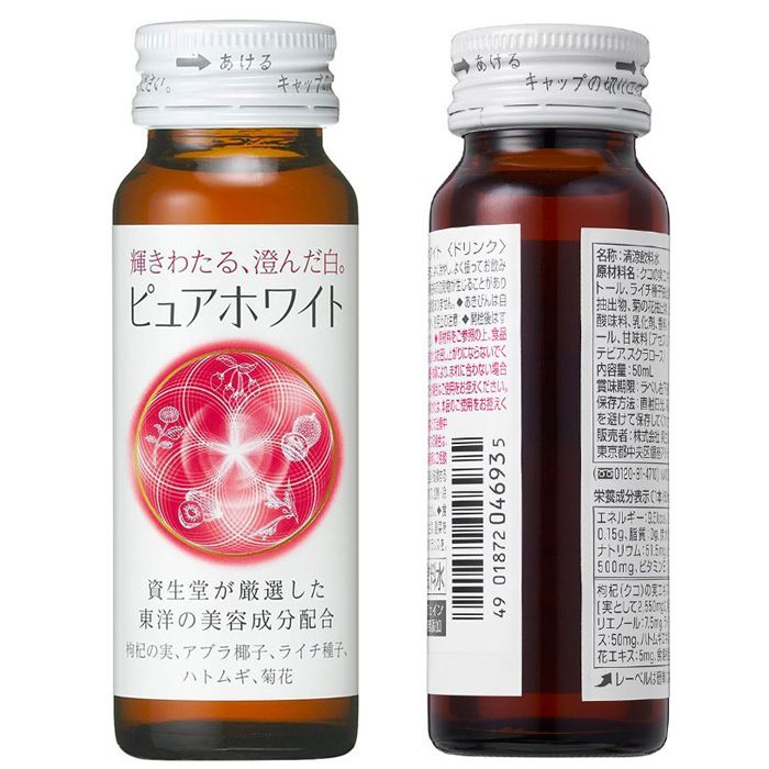 Nước uống Collagen Pure White - Nhật Bản.. Thương hiệu: Shiseido. Xuất xứ: Nhật Bản Quy cách: Hộp 10 lọ - mỗi lọ 50ml 1. CÔNG DỤNG - Nước uống Collagen Pure White hỗ trợ làm trắng da tự nhiên . 2. THÀNH PHẦN: - Chiết xuất wolfberry (kỉ tử): 1500mg (từ 2.550mg trái tươi) - Chiết xuất lúa mạch, ngọc trai: 5mg - Astaxanthin (là chất chống lão hóa cao gấp 100 lần Vitamin E): 3mg - Hesperidin (là dẫn chất của Vitamin C, tác dụng chống oxy hóa): 30mg - Tocotriennol: 7,5mg - Chiết xuất trái vải: ......50mg - Chiết xuất hoa cúc:..... 5mg - Lượng nhỏ tương đương muối: 0,13g - Năng lượng: ...............9,5kcal - Protein (đạm): ...........0,15g - Chất béo: .................0g - Cacbonhydrat:..........2,8g - Natri: .......................51,5mg - Vitamin C: ...............500mg - Vitamin E: ...............1,8mg 3. HƯỚNG DẪN SỬ DỤNG - Dùng 01 lọ/ ngày, sử dụng liên tục trong vòng 30 ngày (tương đương 3 hộp) - Nên dùng sản phẩm vào buổi sáng (dùng sau khi ăn vì sản phẩm chứa nhiều vitamin C). - Uống nhiều nước trong quá trình sử dụng sản phẩm (từ 1,5- 2 lít nước/ ngày). - Khi sử dụng nên cân bằng cả thực phẩm và chế độ ăn uống hàng ngày, đặc biệt là các loại rau, củ quả tươi.
