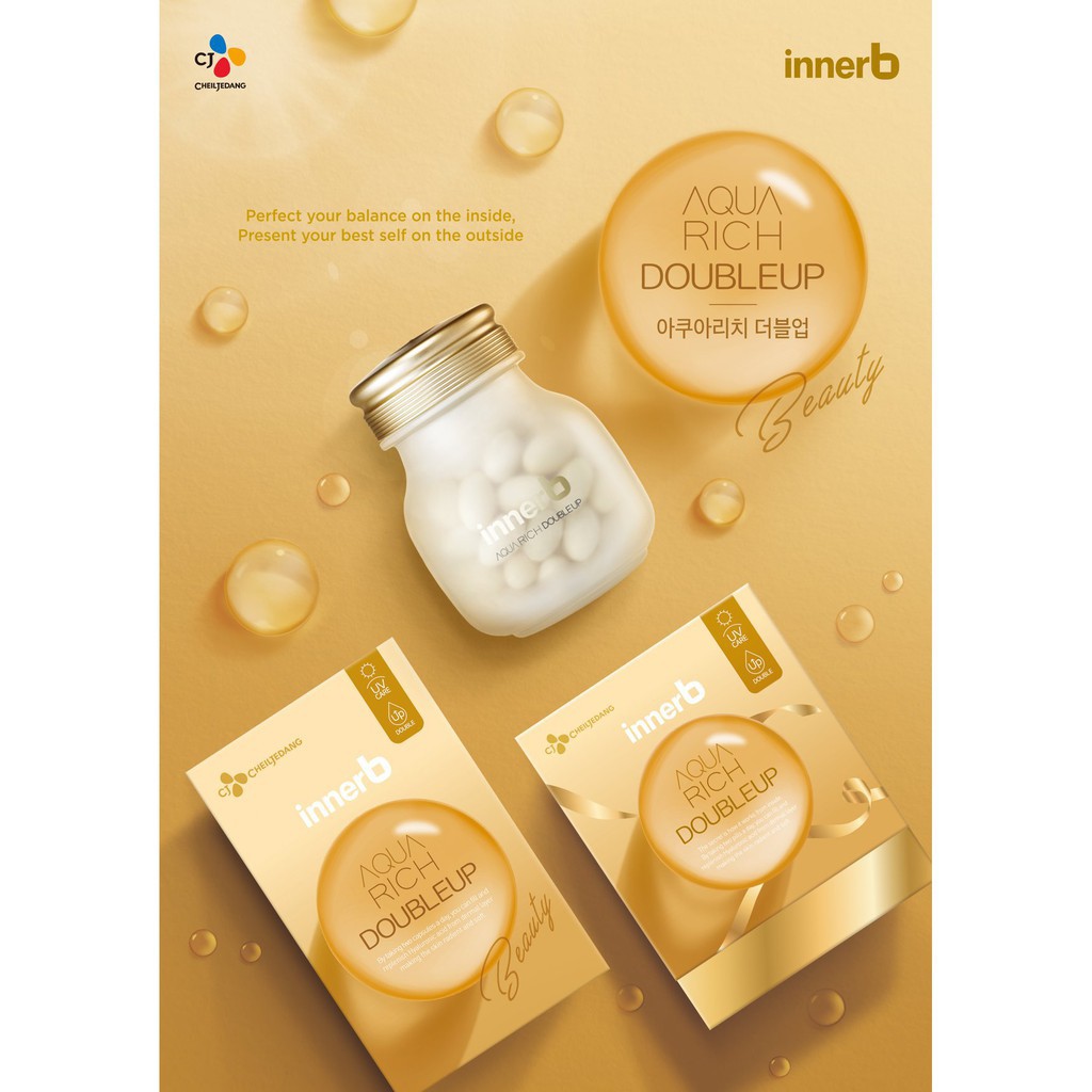 Thương hiệu: InnerXuất xứ thương hiệu: Hàn QuốcSản xuất tại: Hàn QuốcQuy cách đóng gói: Lọ 33.6g - 70 viên Dưới tác động từ môi trường, ánh nắng mặt trời càng trở nên độc hại với tia UVA và UVB gây ảnh hưởng trực tiếp tới sức khỏe và làn da. Lối sống bận rộn cũng khiến da dễ bị tổn thương, thô ráp, kém sức sống vì thiếu nước, thiếu ẩm, lão hóa sớm và xỉn màu. Với “phiên bản nâng cấp” của Aqua Rich, Aqua Rich Double Up chứa gấp đôi hàm lượng Hyaluronic Acid (240mg/ 2 viên), mang lại hiệu quả tối đa, không chỉ cấp nước, cấp ẩm mà còn hỗ trợ giúp da sáng mịn, bảo vệ da trước tác hại từ môi trường. Chỉ 2 viên Innerb Aqua Rich Double Up mỗi ngày cho làn da khỏe mạnh và sáng mịn trước tác hại của tia cực tím gây hại. Thành phần chính:- Hyaluronic acid 240mg: Đây là thành phần quan trọng nằm tại lớp trung bì của da, có khả năng giữ nước gấp 1000 lần trọng lượng của nó, có công dụng giúp giữ ẩm và mang đến làn da căng mượt, bóng mịn. Hàm lượng Hyaluronic acid bên trong cơ thể sẽ bị giảm đi đáng kể sau tuổi 30.Công dụng:- Bổ sung Hyaluronic Acid cho làn da- Giúp tăng độ ẩm cho làn da- Hỗ trợ da sáng mịn- Bảo vệ da trước ánh nắng mặt trờiĐối tượng sử dụng:- Người làm việc, tiếp xúc nhiều với ánh sáng mặt trời cần bảo vệ da- Người có nhu cầu làm đẹp daHướng dẫn sử dụng:- Sử dụng 2 viên/ngày với lượng nước vừa đủ.Hướng dẫn bảo quản:- Đậy kín nắp sản phẩm sau khi sử dụng.- Bảo quản ở nhiệt độ phòng - Tránh ánh nắng trực tiếp và những nơi gần nguồn nhiệt, ẩm mốc.- Tránh xa tầm tay của trẻ em.Lưu ý: - Không vượt quá liều khiếu cáo, giữ xa tầm tay trẻ em.- Không sử dụng sản phẩm khi mẫn cảm với bất kỳ thành phần nào của sản phẩm.- Phụ nữ mang thai và đang cho con bú, những người có thể trạng đặc biệt, bị dị ứng không nên sử dụng. - Nếu bị dị ứng với một số thành phần nhất định, phải kiểm tra tên nguyên liệu trước khi sử dụng. - Các viên nang có thể dính vào nhau khi bảo quản ở nhiệt độ cao.- Tuyệt đối không được ăn silica gel, một chất hút ẩm mạnh, vì đó không phải là chất dùng để ăn.- Không dùng sản phẩm nếu tem bảo vệ không nguyên vẹn. ***Khuyến cáo sản phẩm này không phải là thuốc và không có tác dụng thay thế thuốc chữa bệnh.THÔNG TIN THƯƠNG HIỆU:InnerB là thương hiệu trực thuộc CJ CheiJedang – công ty con củaTập đoàn CJ – chuyên sản xuất và kinh doanh mặt hàng thực phẩm bằng ứng dụng công nghệ sinh học. Kể từ khi được sáng lập vào năm 1953 và chính thức tách ra hoạt động độc lập năm 1993, CJ CheiJedang đã có những bước tiến vững chắc và luôn theo đuổi giá “first – best – different” - "Luôn tiên phong trong mọi khía cạnh với các sản phẩm khác biệt, có chất lượng tốt hàng đầu”. Hơn 60 năm qua, CJ CheilJedang không ngừng chú trọng đầu tư công nghệ, tìm kiếm các thành phần tự nhiên an toàn và có lợi cho sức khỏe, làn da của phái đẹp. Ra mắt vào tháng 05/2009 với sản phẩm đầu tiên là InnerB Aqua Bank (lọ màu hồng), từ đó đến nay, Innerb đã mang về cho CJ rất nhiều giải thưởng lớn và danh giá. Các sản phẩm từ InnerB giúp bổ sung độ ẩm, cung cấp Hyaluronic acid, collagen,... cải thiện và chăm sóc làn da từ sâu bên trong, mang đến cho bạn một làn da mịn mượt, căng mướt và khỏe mạnh.