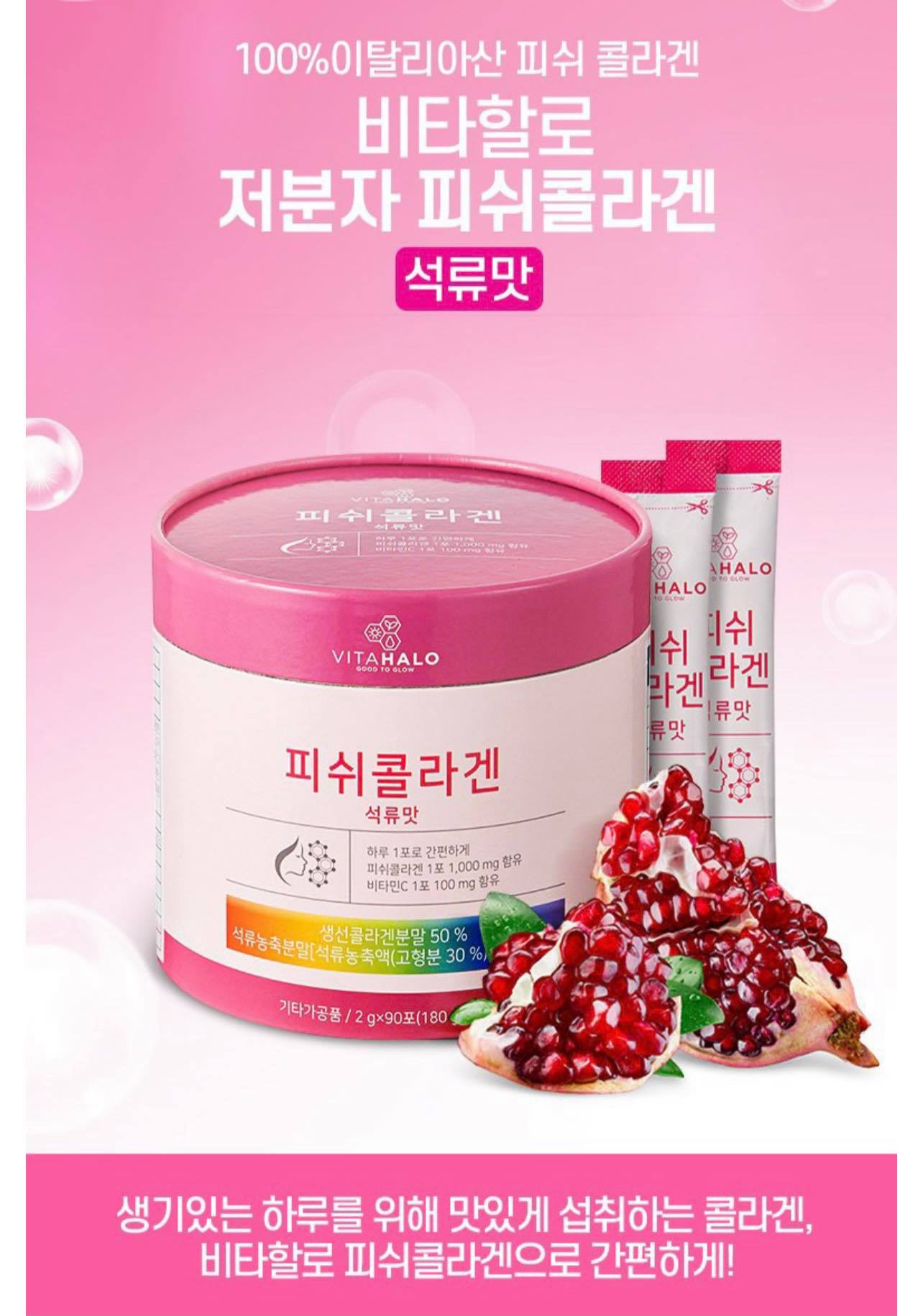 피쉬콜라겐Collagen VitahaloThành phần chính là:Collagen Vitamin CChiết xuất từ trái lựu đỏ❁Collagen Vitahalo dạng bột ăn trực tiếp hoặc pha với nước dễ dàng hấp thu vào tế bào da, giúp tăng độ đàn hồi của da, giảm tình trạng da chảy xệ.❁ Nước uống Collagen giúp làn da mịn màng nhờ thành phần vitamin C, cân bằng độ ẩm và cung cấp nước cho da mềm mại, không bị khô, hỗ trợ cải thiện trạng khô da suốt cả ngày. Vt Collagen giúp da mềm mịn sáng hơn mỗi ngày, đồng thời làm mờ các vết nám, thu nhỏ lỗ chân lông, mang đến một làn da khỏe mạnh. ❁ Chứa chiết xuất từ các loại dâu thiên nhiên Vt Collagen Hàn Quốc dưỡng da an toàn, không gây kích ứng da Aicũng biết công dụng của collagen và vitamin c đối với da rồi ạ. Hơn nữa tp vitamin C còn giúp trống oxi hoá, tăng kháng thể, đẩy lùi virus, đẩy lùi bệnh tật, đẩy lùi ung thư... và quan trọng là đẩy lùi tuổi già, đẩy lùi xấu xí hihiMỘT SẢN PHẨM RẤT RẤT KHUYÊN DÙNG HẰNG NGÀY 1 hộp 90 gói dùng trong 3 tháng vừa kinh tế vừa chăm sóc làm đẹp cho bản thân tội gì mà không dùng phải ko ạ?